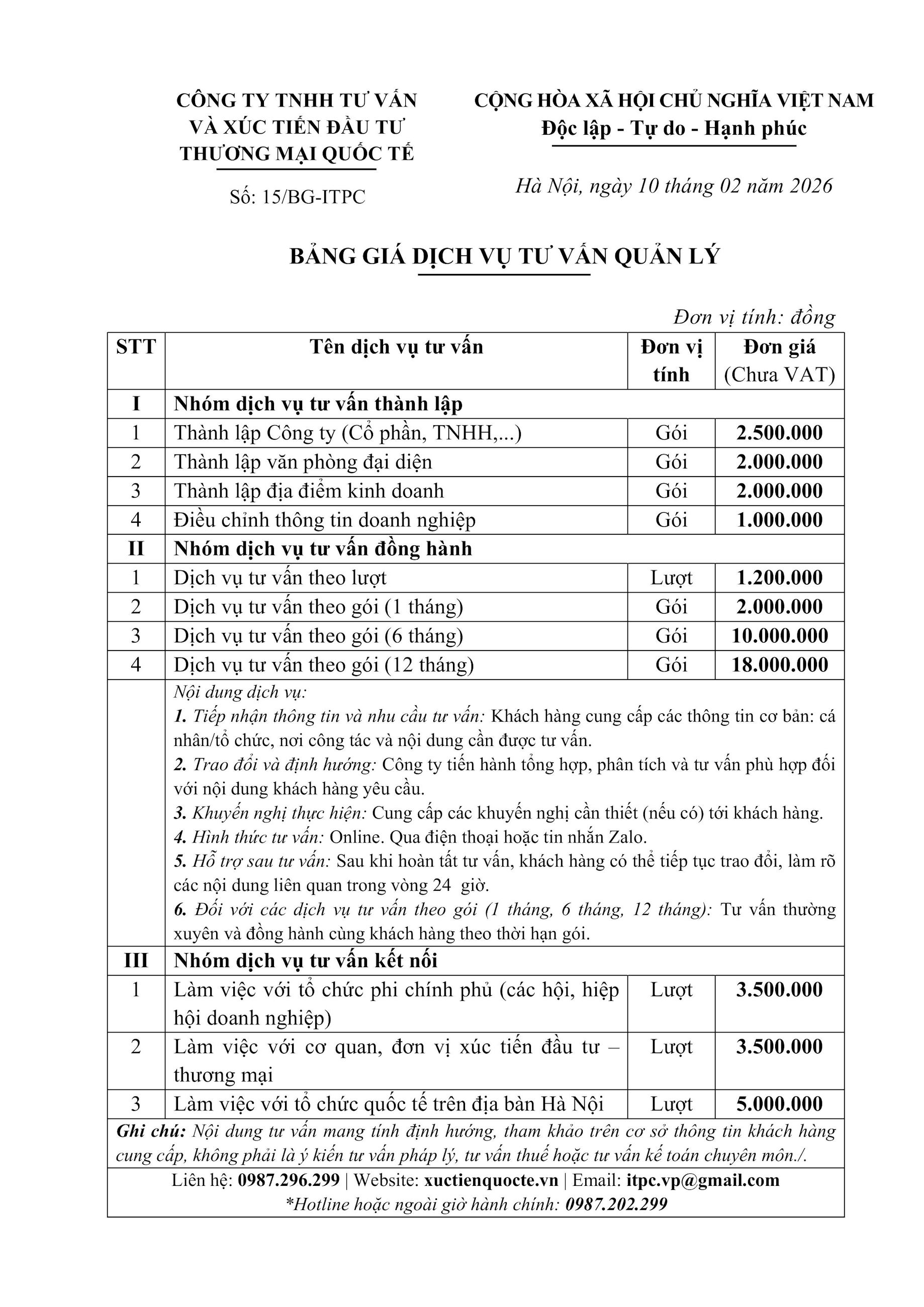BẢNG GIÁ DỊCH VỤ TƯ VẤN