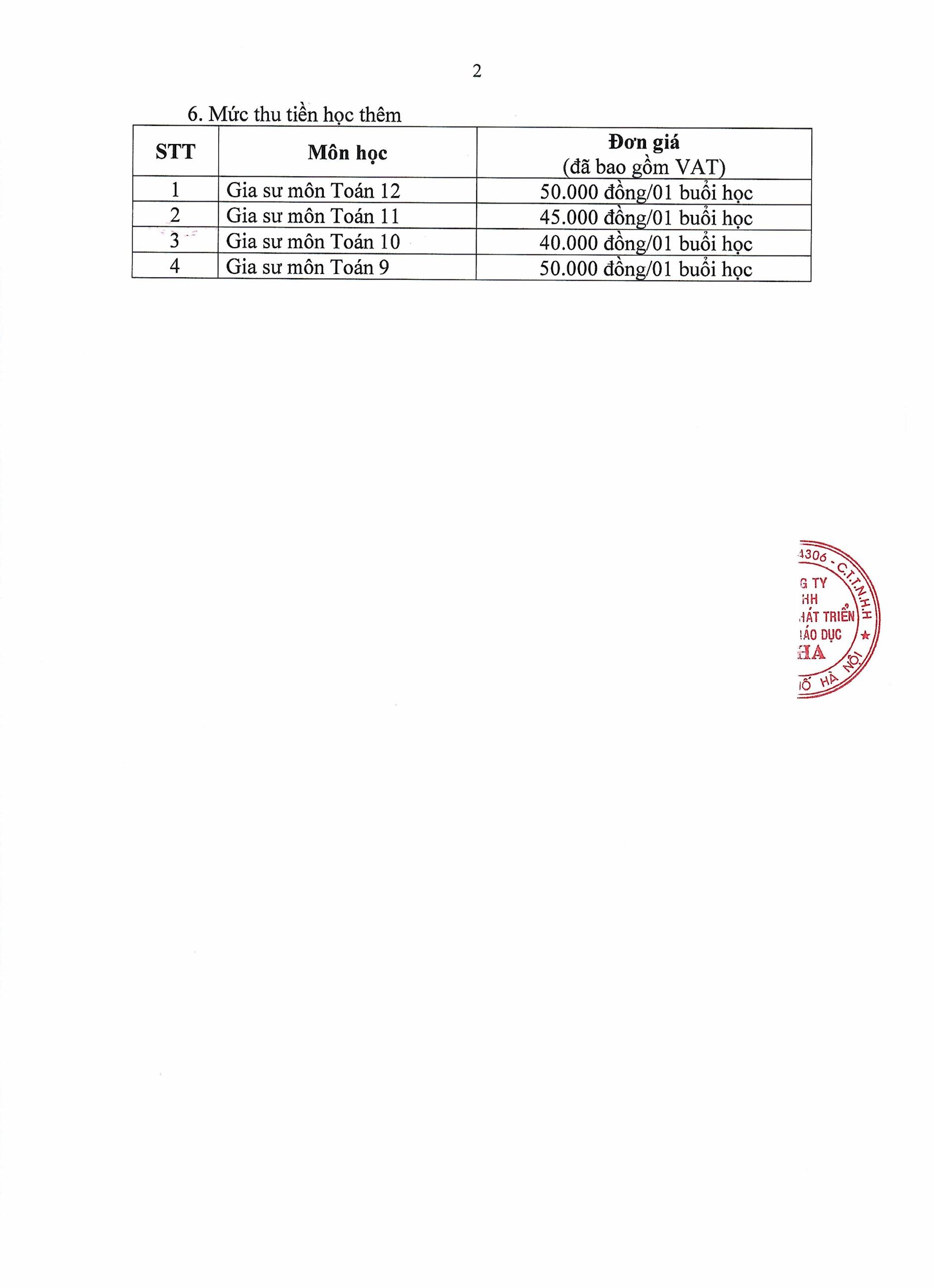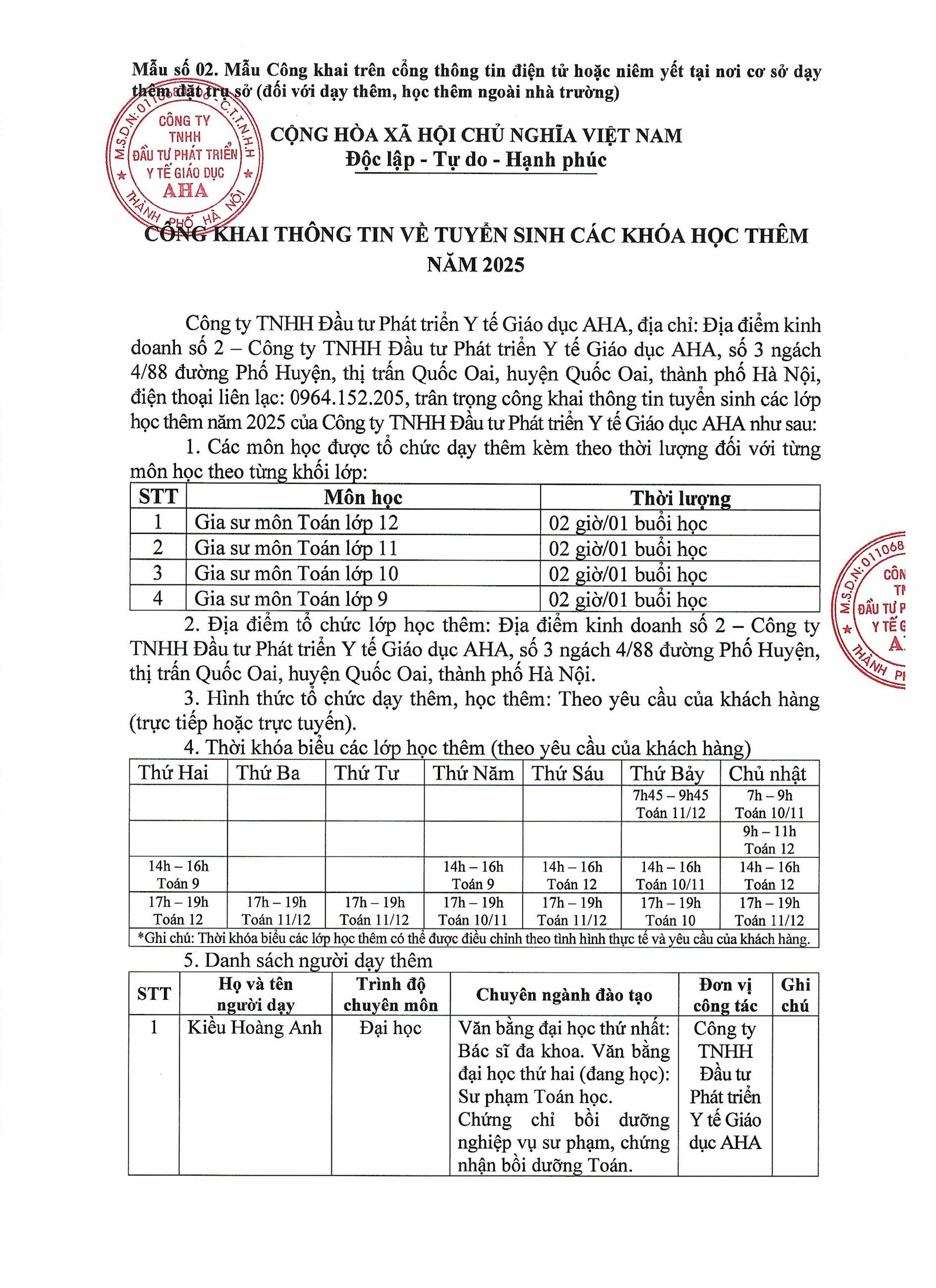 Căn cứ điểm b, khoản 1, Điều 6, Thông tư 29/2024/TT-BGDĐT ngày 30 tháng 12 năm 2024 của Bộ Giáo dục và Đào tạo quy định về dạy thêm, học thêm, trên cơ sở thông báo số 10/TB-ITPC-AHA ngày 23 tháng 4 năm 2025 của Công ty TNHH Tư vấn và Xúc tiến Đầu tư Thương mại Quốc tế và Công ty TNHH Đầu tư Phát triển Y tế Giáo dục AHA về việc công khai thông tin trên cổng thông tin điện tử, thông báo số 14/TB-ITPC ngày 25/7/2025 của Công ty TNHH Tư vấn và Xúc tiến Đầu tư Thương mại Quốc tế về việc điều chỉnh và cập nhật thông tin tại mục 3 Thông báo số 10/TB-ITPC-AHA ngày 23/4/2025, Công ty TNHH Đầu tư Phát triển Y tế Giáo dục AHA thực hiện công khai trên cổng thông tin điện tử về các môn học được tổ chức dạy thêm; thời lượng dạy thêm đối với từng môn học theo từng khối lớp; địa điểm, hình thức, thời gian tổ chức dạy thêm, học thêm; danh sách người dạy thêm và mức thu tiền học thêm trước khi tuyển sinh các lớp dạy thêm, học thêm (theo Mẫu số 02 tại Phụ lục kèm theo Thông tư 29/2024/TT-BGDĐT), cụ thể như sau:
