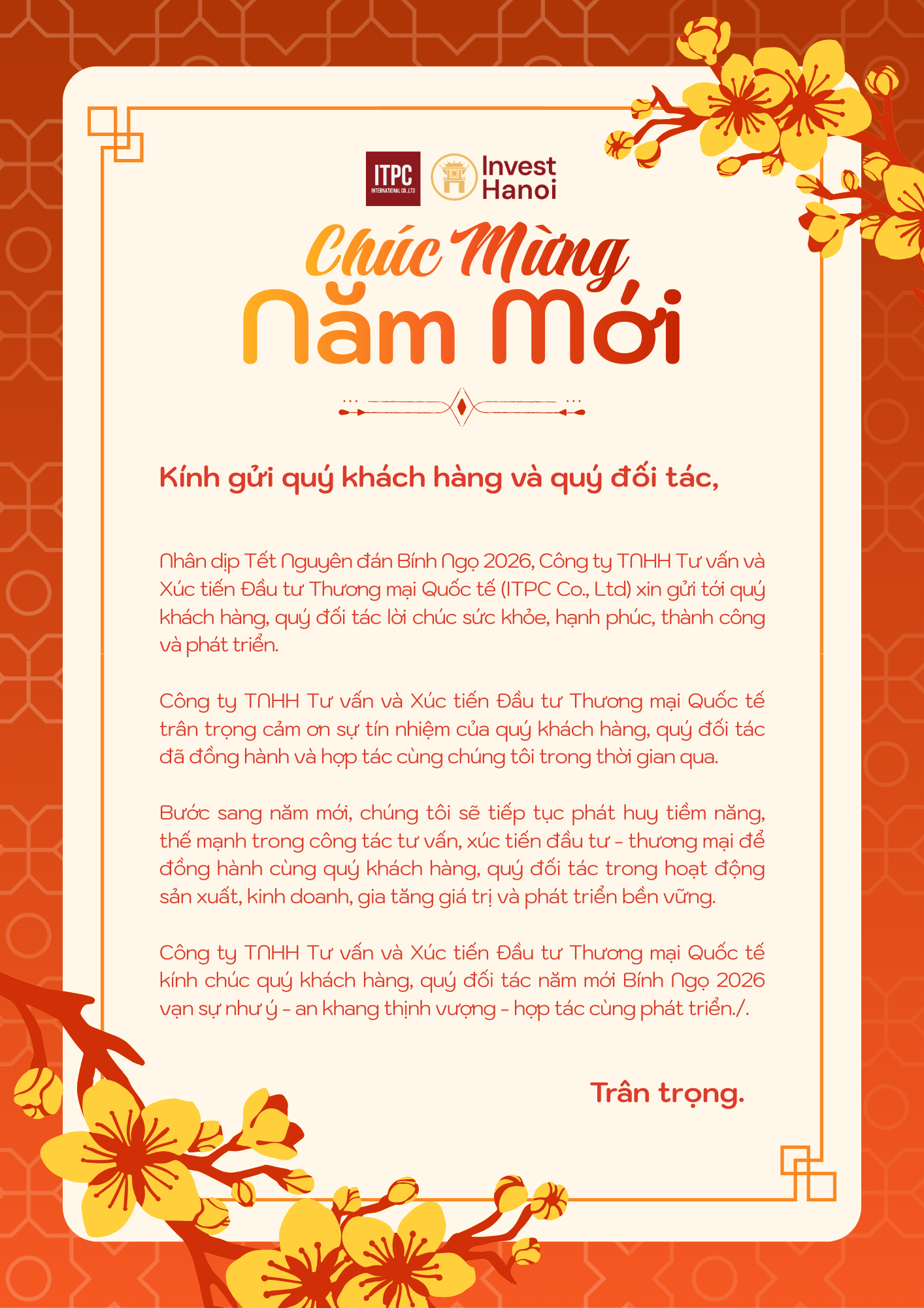 Nhân dịp Tết Nguyên đán Bính Ngọ 2026, Công ty TNHH Tư vấn và Xúc tiến Đầu tư Thương mại Quốc tế (ITPC Co., Ltd) xin gửi tới quý khách hàng, quý đối tác lời chúc sức khỏe, hạnh phúc, thành công và phát triển...