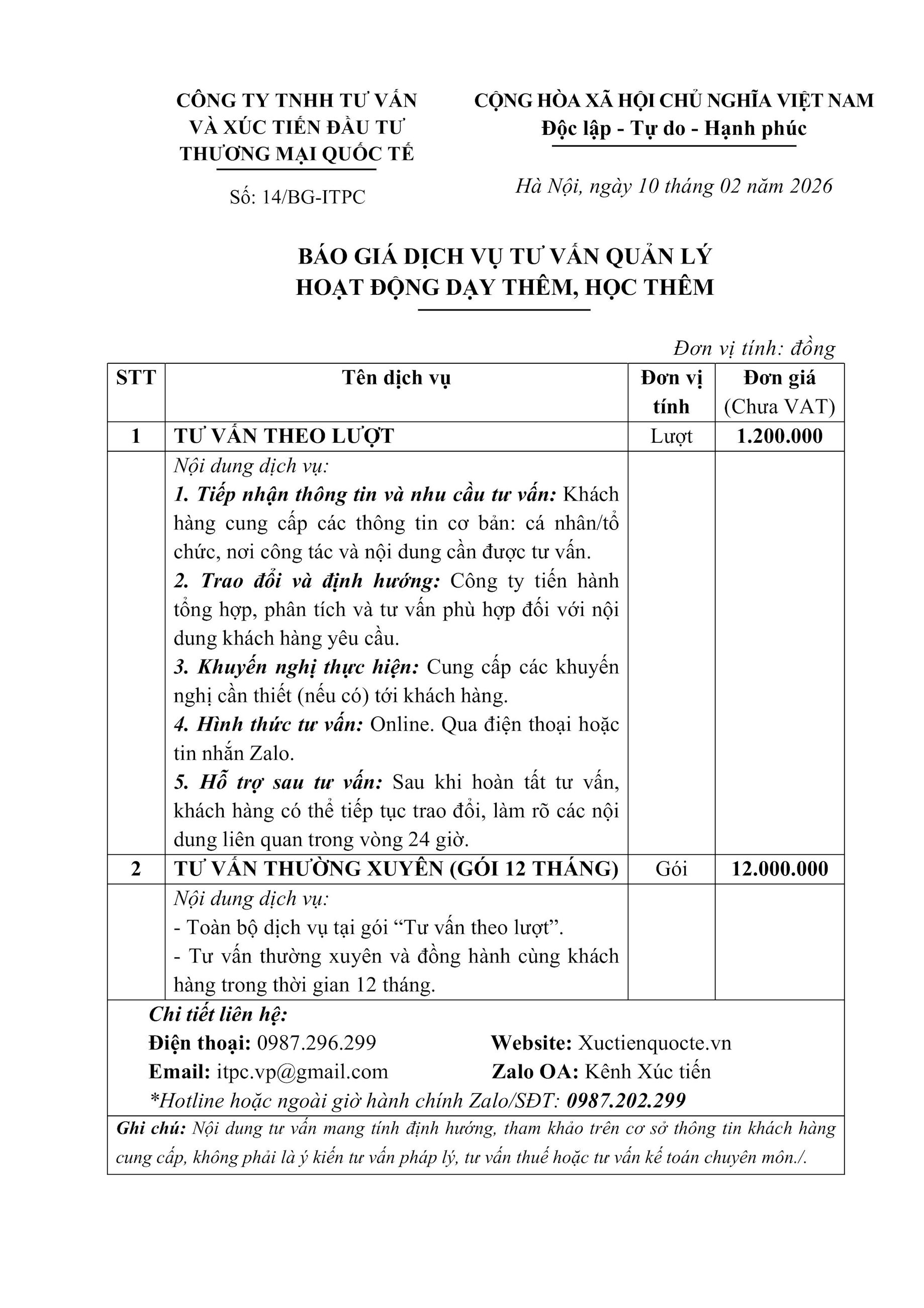BẢNG GIÁ DỊCH VỤ TƯ VẤN