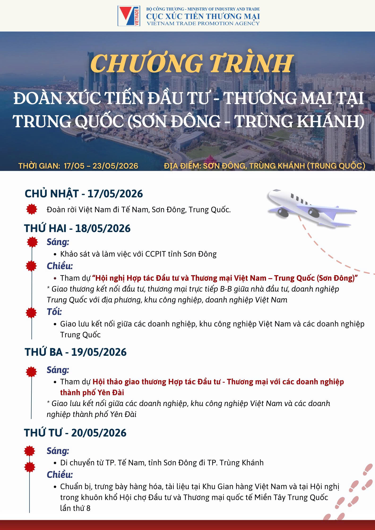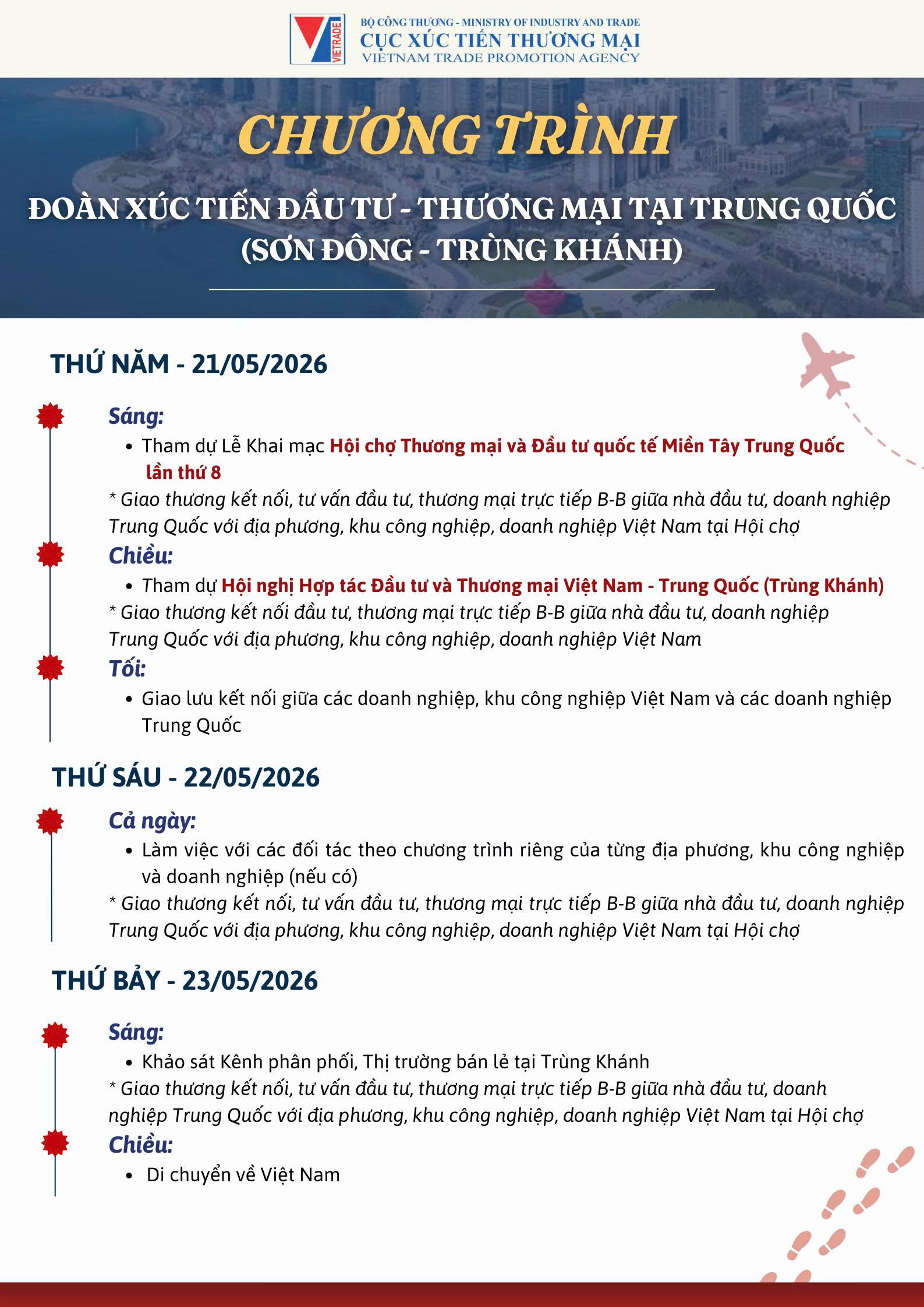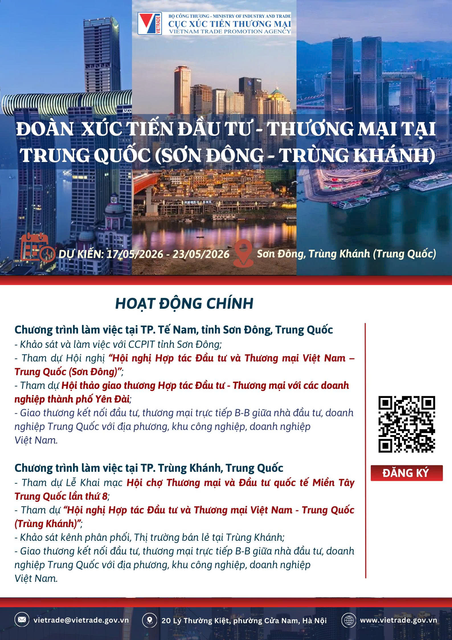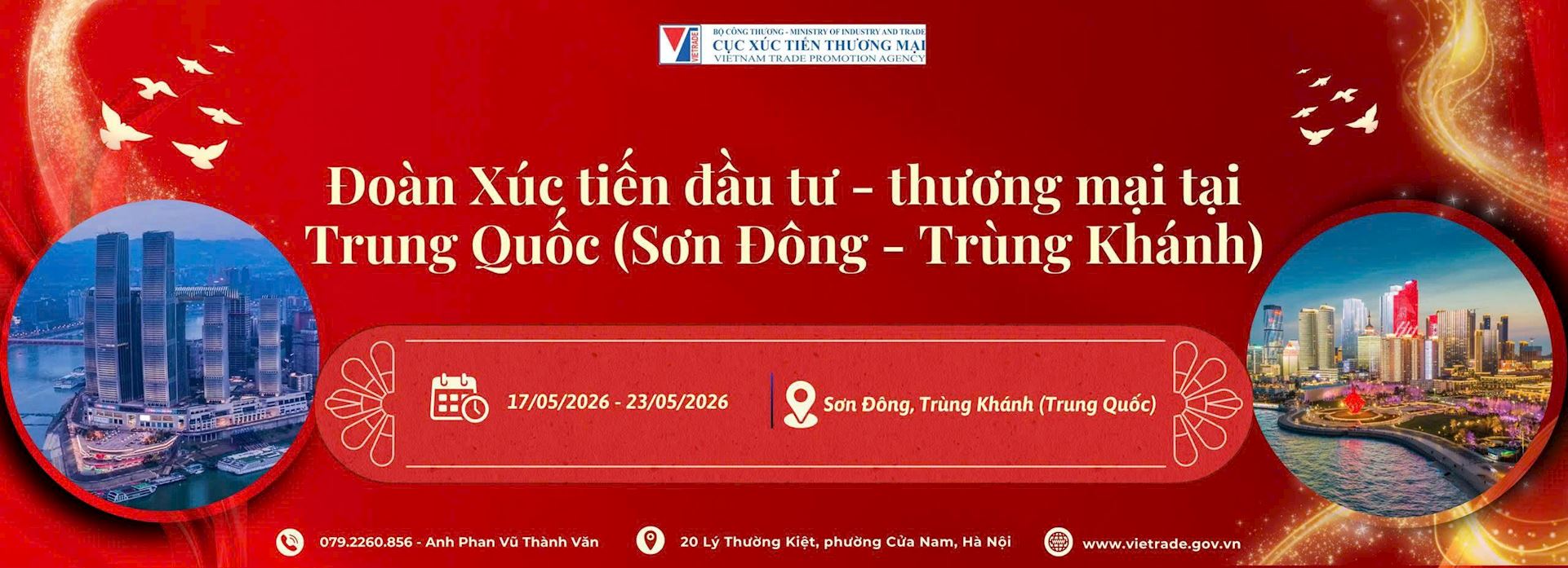 Thực hiện Chương trình cấp quốc gia về Xúc tiến thương mại năm 2026, Bộ Công Thương giao Cục Xúc tiến thương mại (XTTM) phối hợp với Thương vụ Việt Nam tại Trung Quốc, Văn phòng Xúc tiến thương mại Việt Nam tại Trùng Khánh, và các tổ chức XTTM của Trung Quốc tổ chức Đoàn Xúc tiến Đầu tư - Thương mại tại Trung Quốc (Sơn Đông – Trùng Khánh), thông tin cụ thể như sau: