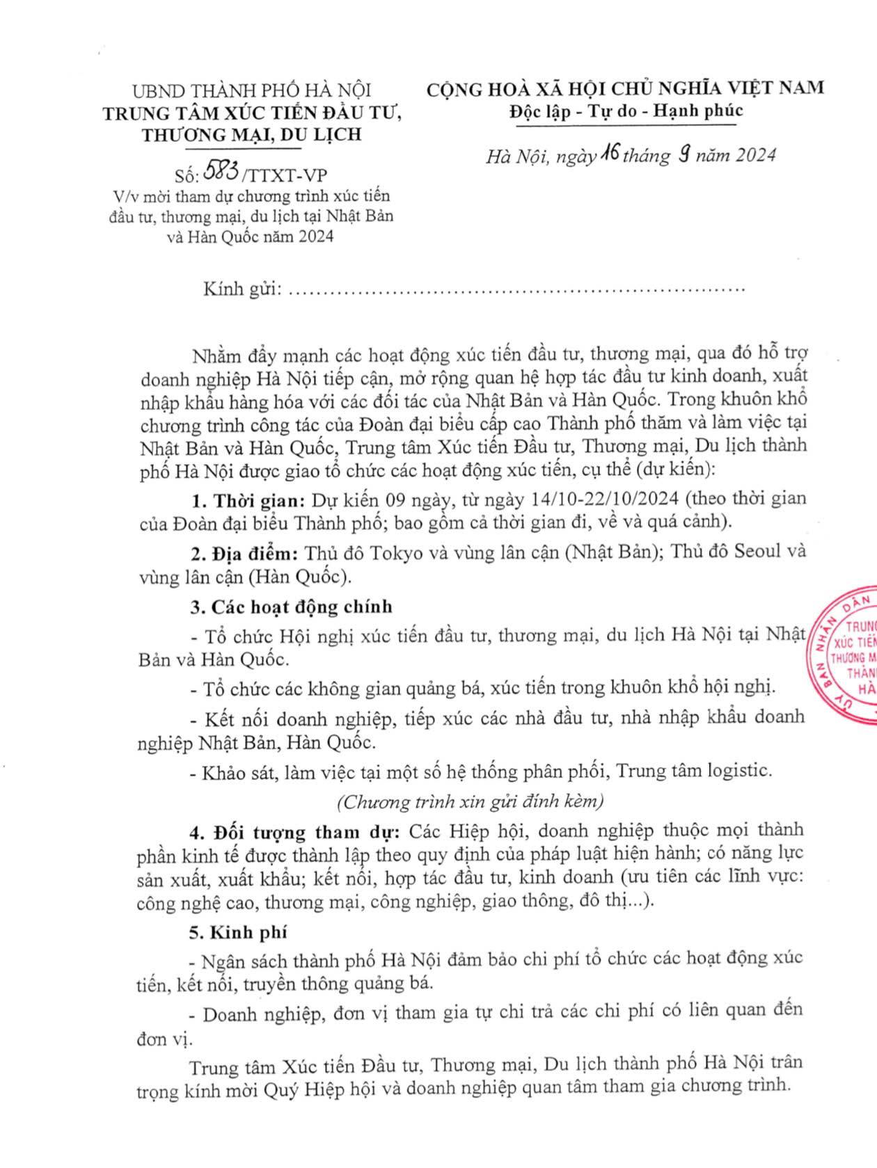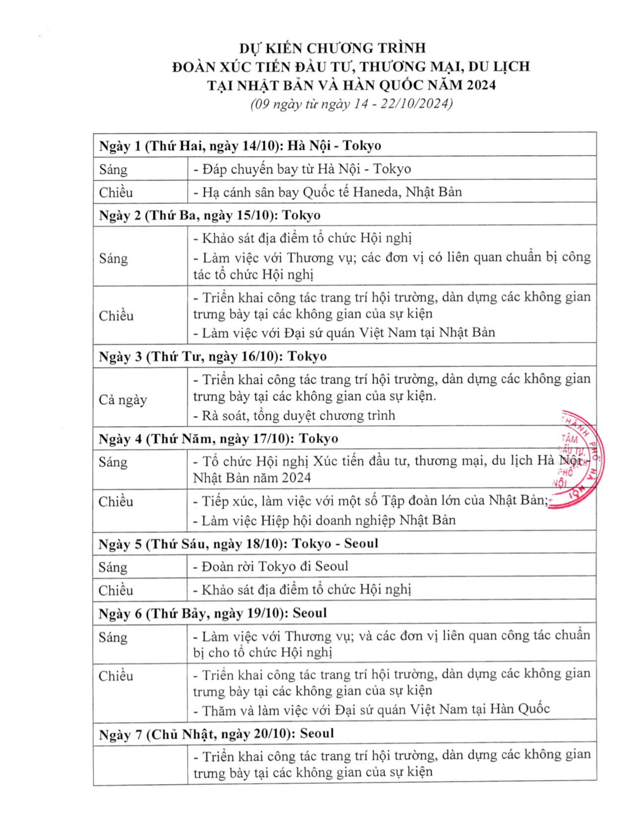 Hà Nội mời tham dự chương trình xúc tiến đầu tư, thương mại, du lịch tại Nhật Bản và Hàn Quốc năm 2024