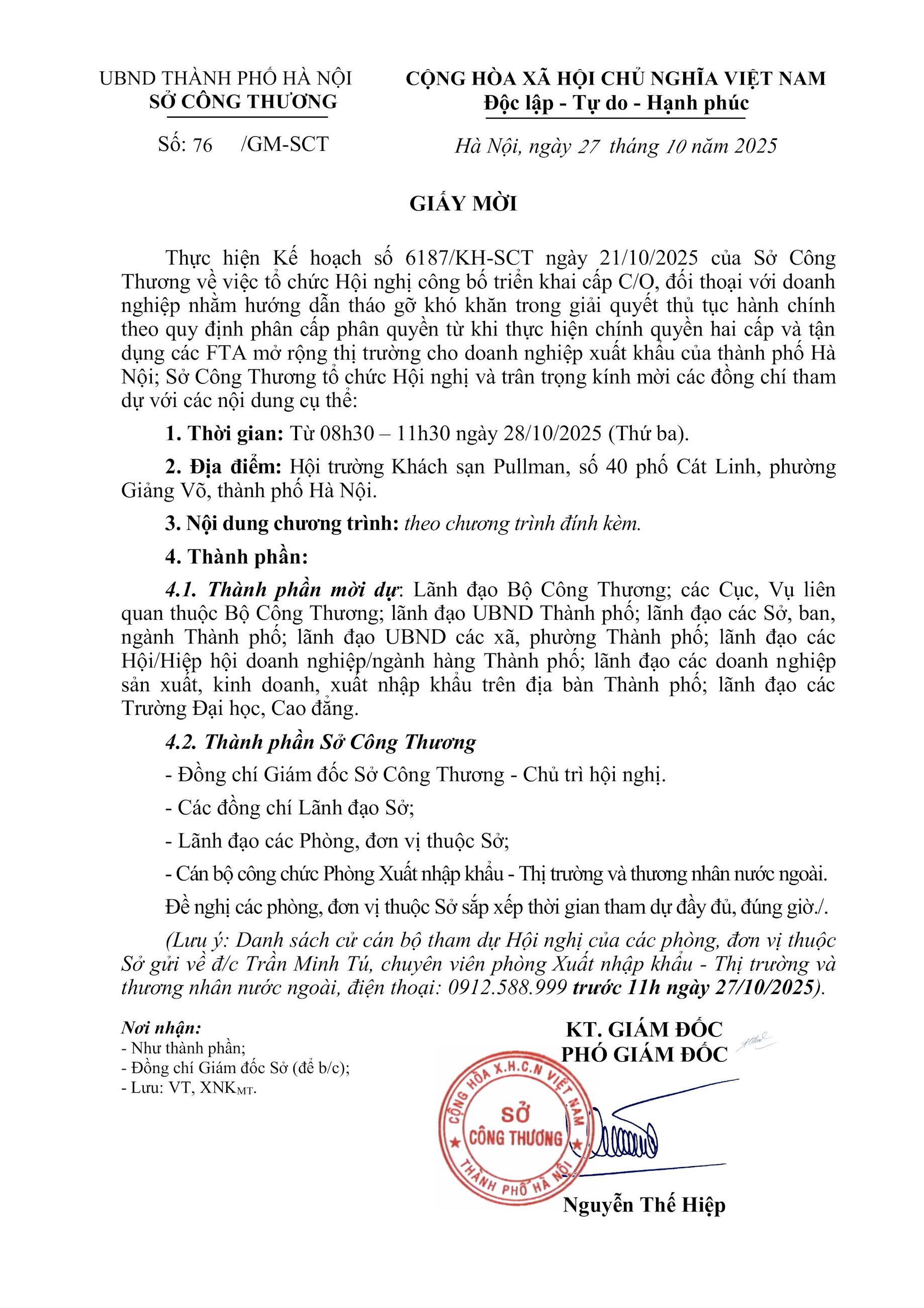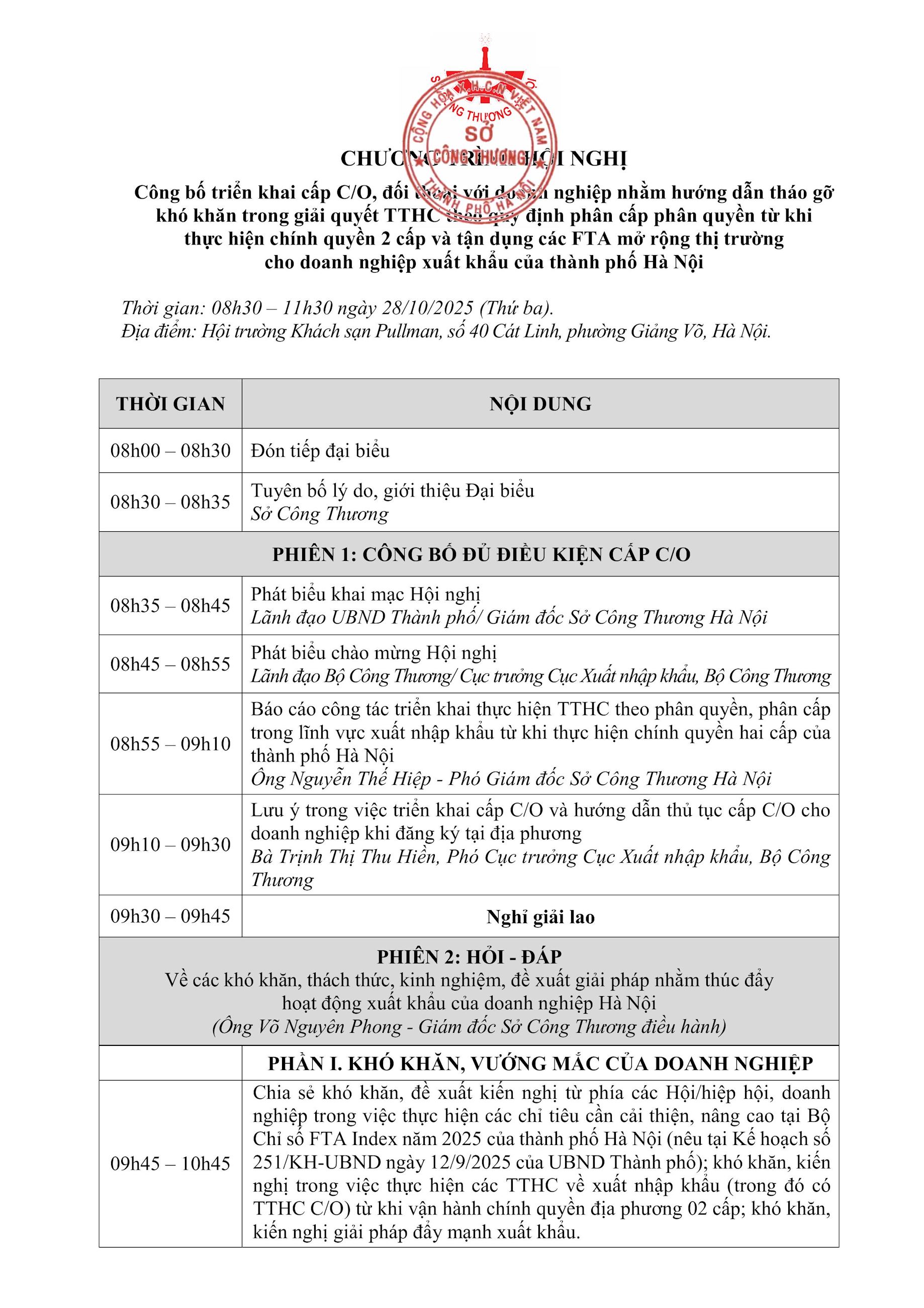 Hội nghị Công bố triển khai cấp C/O, đối thoại với doanh nghiệp nhằm tháo gỡ khó khăn trong giải quyết TTHC theo quy định phân cấp phân quyền từ khi thực hiện chính quyền 2 cấp và tận dụng các FTA mở rộng thị trường cho doanh nghiệp xuất khẩu của thành phố Hà Nội