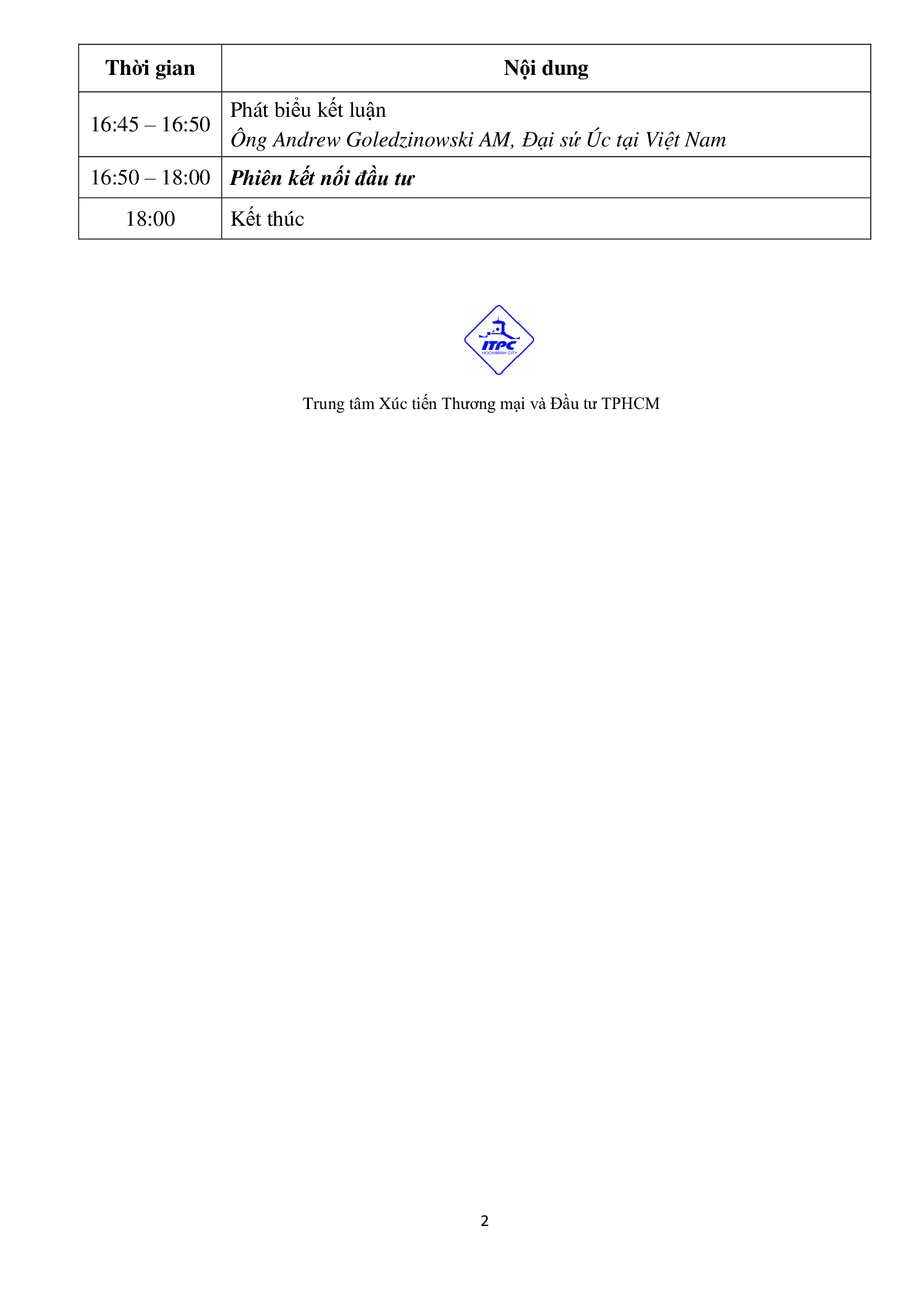 - Phiên kết nối đầu tư: 17 giờ 00 phút đến 18 giờ 00 phút.