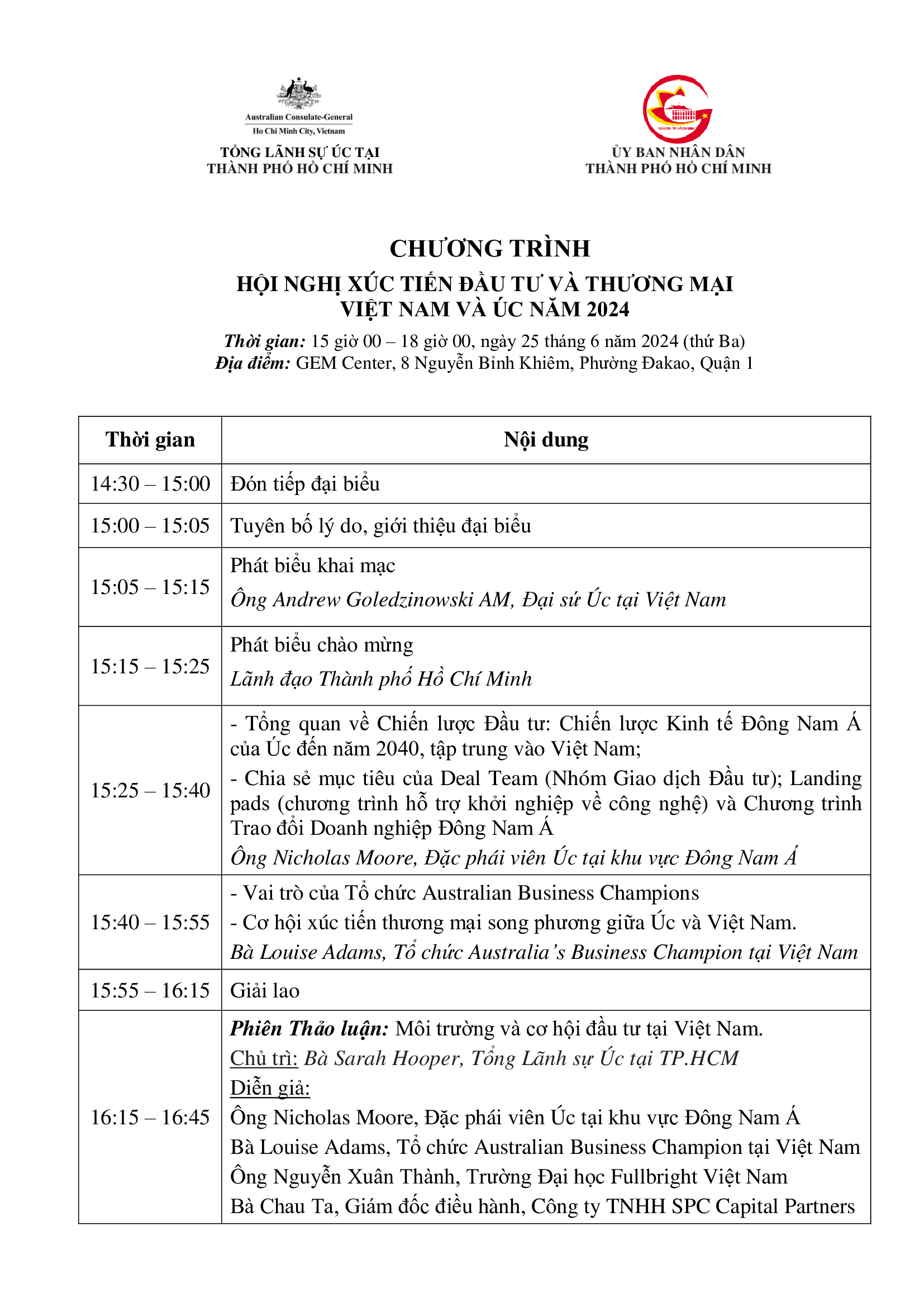 Nhằm thúc đẩy quan hệ thương mại song phương, tăng cường cơ hội đầu tư hai chiều, Trung tâm Xúc tiến Thương mại và Đầu tư TP.HCM (ITPC) phối hợp Tổng Lãnh sự Úc tại Thành phố Hồ Chí Minh tổ chức “Hội nghị xúc tiến đầu tư và thương mại Việt Nam và Úc năm 2024”