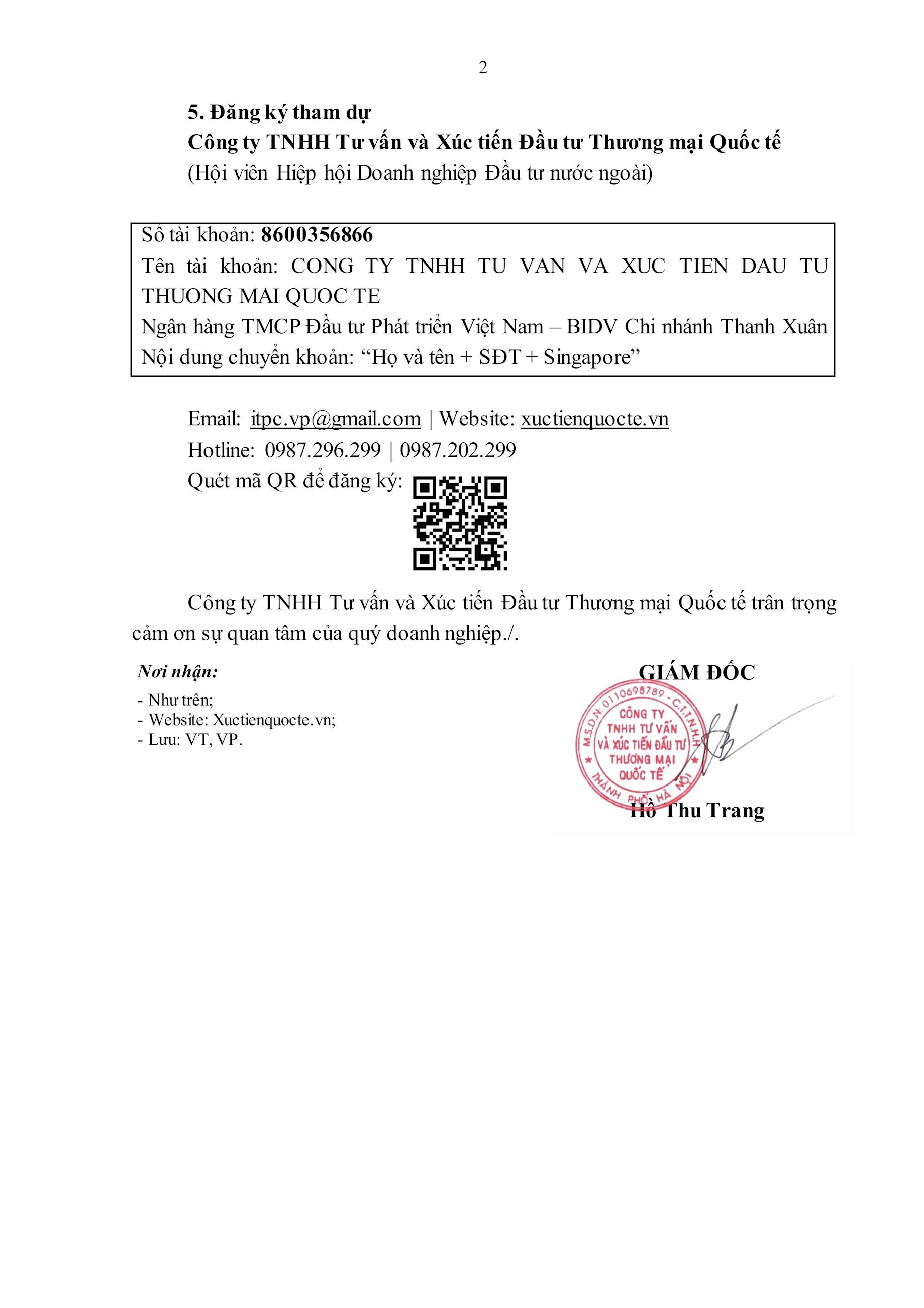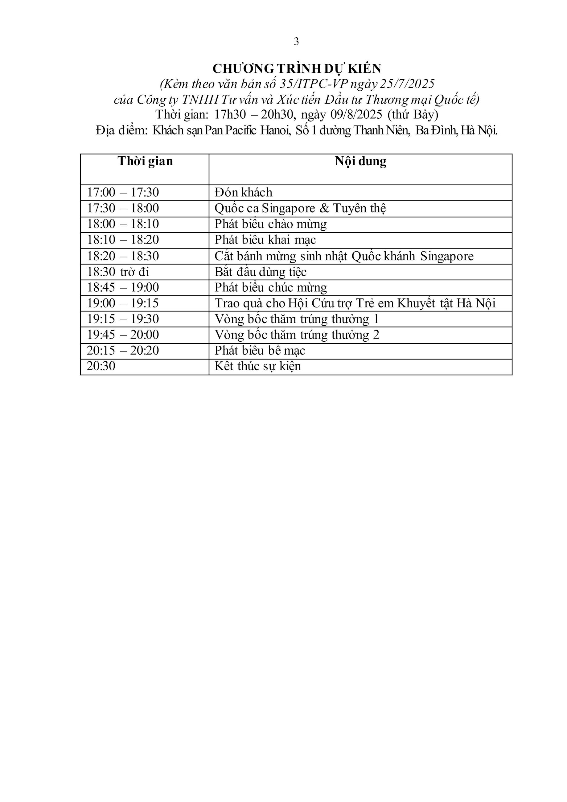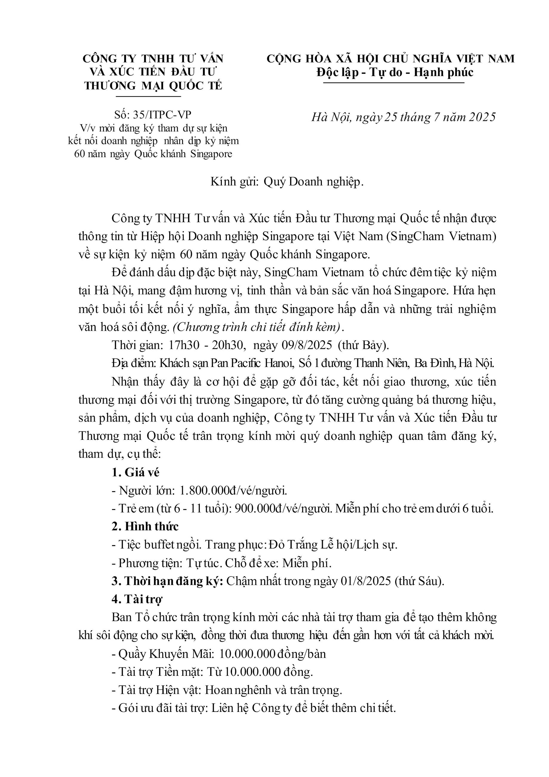 Công ty TNHH Tư vấn và Xúc tiến Đầu tư Thương mại Quốc tế nhận được thông tin từ Hiệp hội Doanh nghiệp Singapore tại Việt Nam (SingCham Vietnam) về sự kiện kỷ niệm 60 năm ngày Quốc khánh Singapore. Để đánh dấu dịp đặc biệt này, SingCham Vietnam tổ chức đêm tiệc kỷ niệm tại Hà Nội, mang đậm hương vị, tinh thần và bản sắc văn hoá Singapore. Hứa hẹn một buổi tối kết nối ý nghĩa, ẩm thực Singapore hấp dẫn và những trải nghiệm văn hoá sôi động.