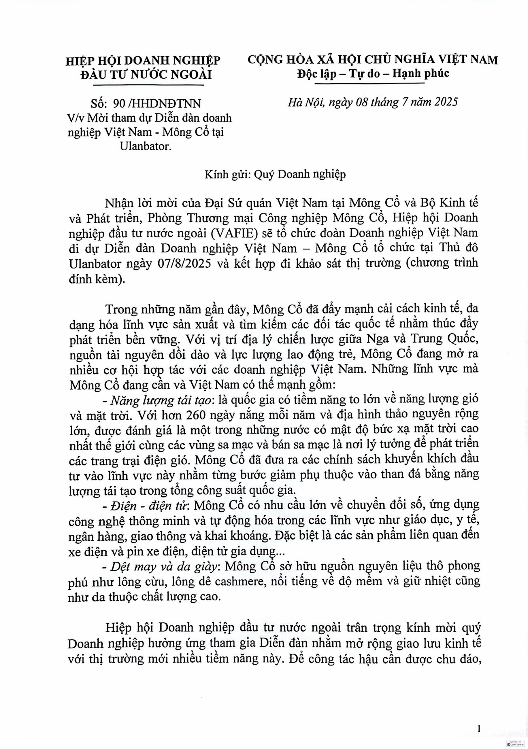 Mời tham dự Diễn đàn doanh nghiệp Việt Nam - Mông Cổ tại Ulanbator