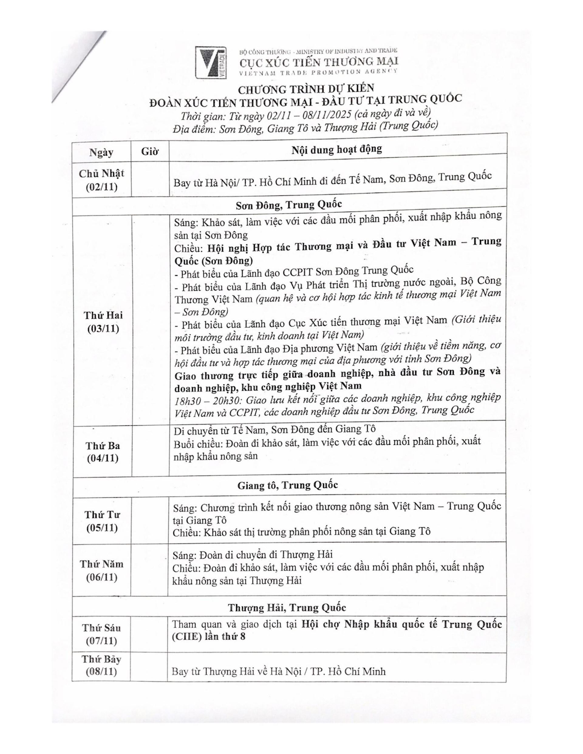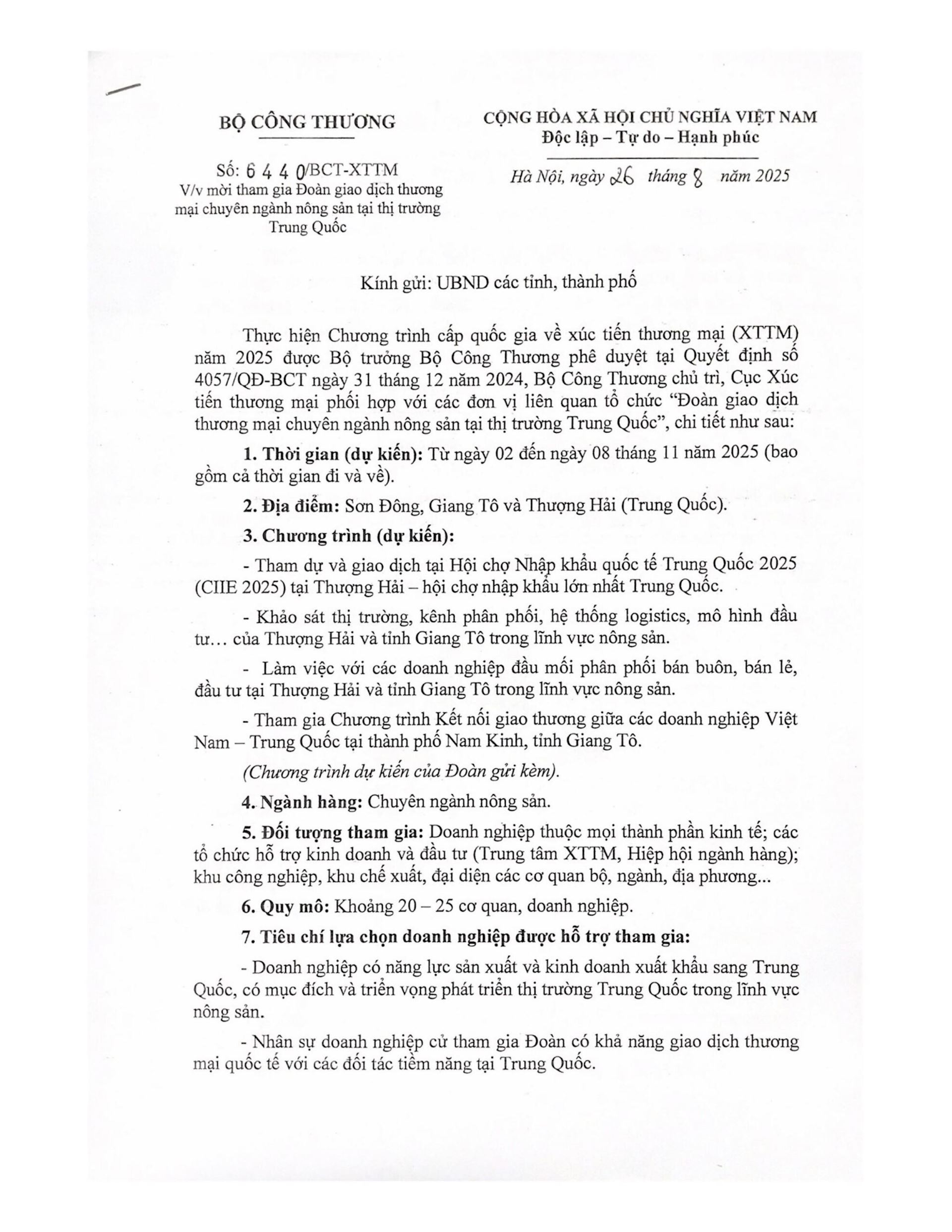 Thực hiện chương trình cấp quốc gia về xúc tiến thương mại (XTTM) năm 2025 được Bộ trưởng Bộ Công Thương phê duyệt tại Quyết định số 4057/QĐ-BCT ngày 31 tháng 12 năm 2024, Bộ Công Thương chủ trì, Cục Xúc tiến thương mại phối hợp với các đơn vị liên quan tổ chức "Đoàn giao dịch thương mại chuyên ngành nông sản tại thị trường Trung Quốc", chi tiết như sau: