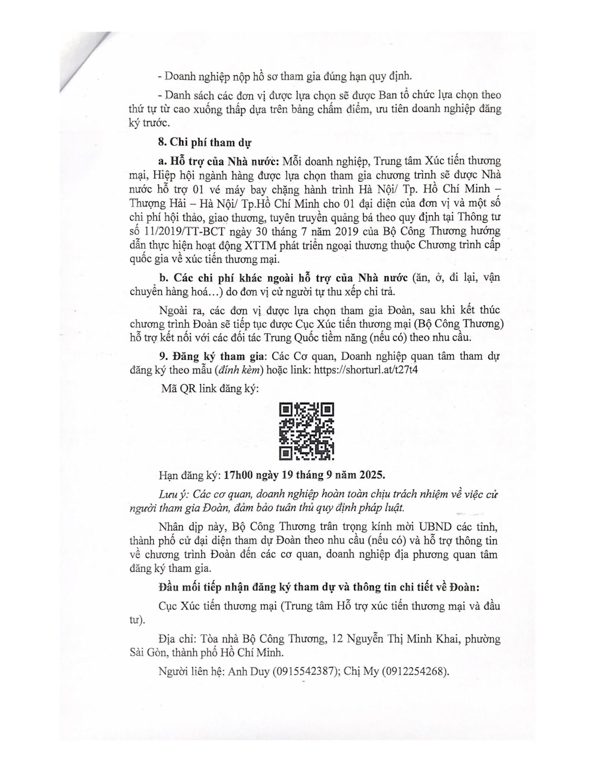Ngoài ra, các đơn vị được lựa chọn tham gia Đoàn, sau khi kết thúc chương trình Đoàn sẽ tiếp tục được Cục Xúc tiến thương mại (Bộ Công Thương) hỗ trợ kết nối với các đối tác Trung Quốc tiềm năng (nếu có) theo nhu cầu.
