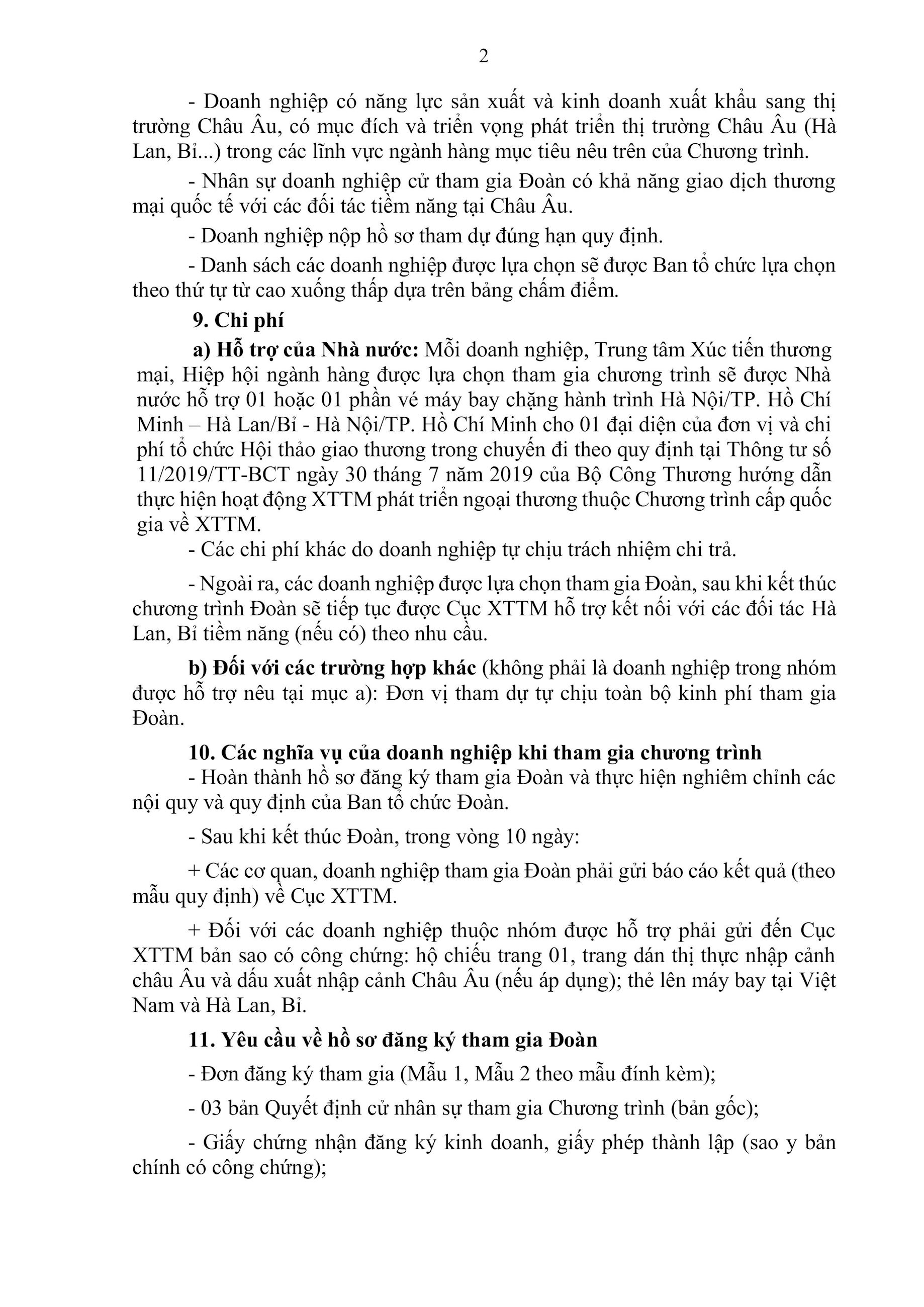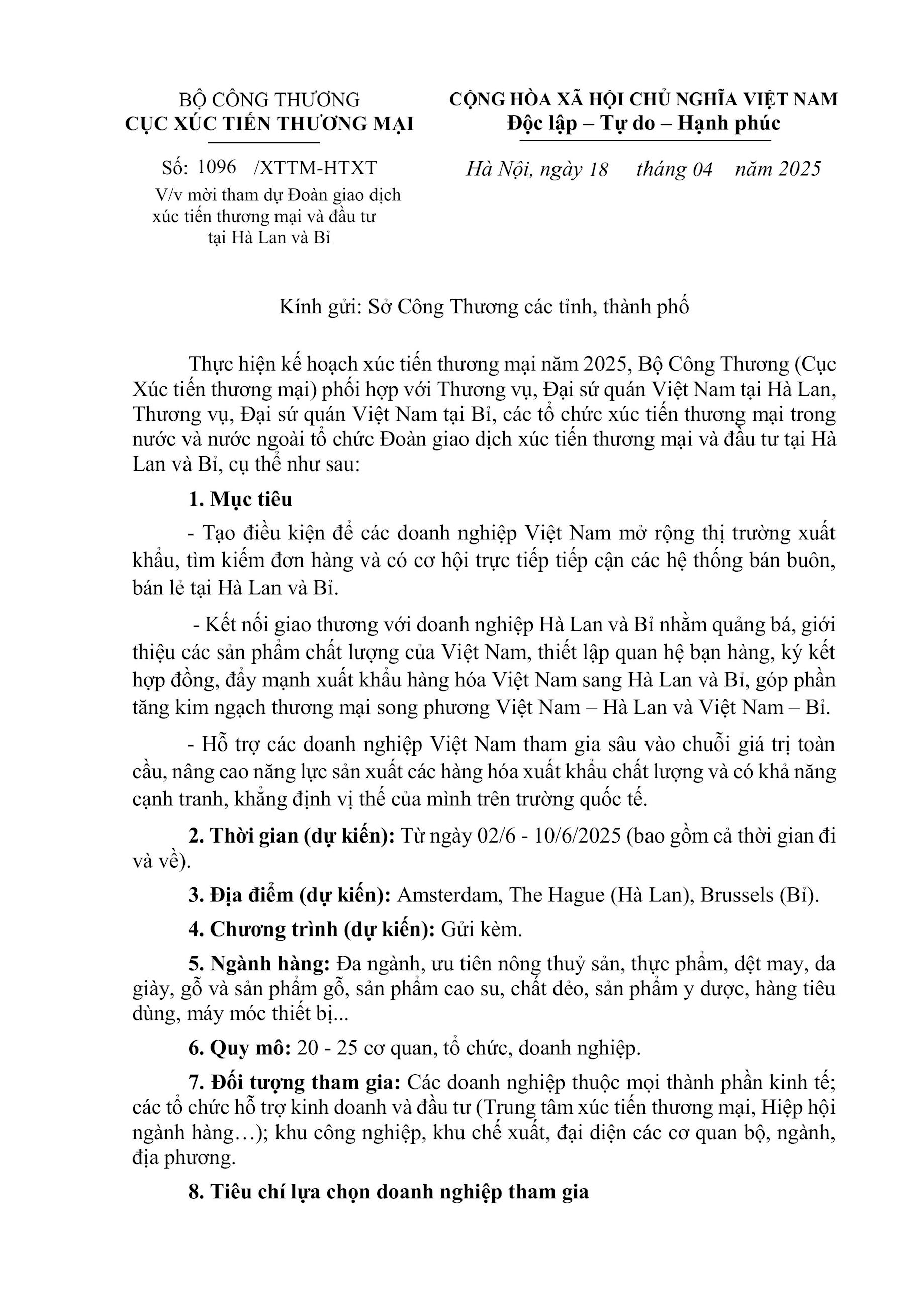 Thực hiện kế hoạch xúc tiến thương mại năm 2025, Bộ Công Thương (Cục Xúc tiến thương mại) phối hợp với Thương vụ, Đại sứ quán Việt Nam tại Hà Lan, Thương vụ, Đại sứ quán Việt Nam tại Bỉ, các tổ chức xúc tiến thương mại trong nước và nước ngoài tổ chức Đoàn giao dịch xúc tiến thương mại và đầu tư tại Hà Lan và Bỉ, cụ thể như sau: