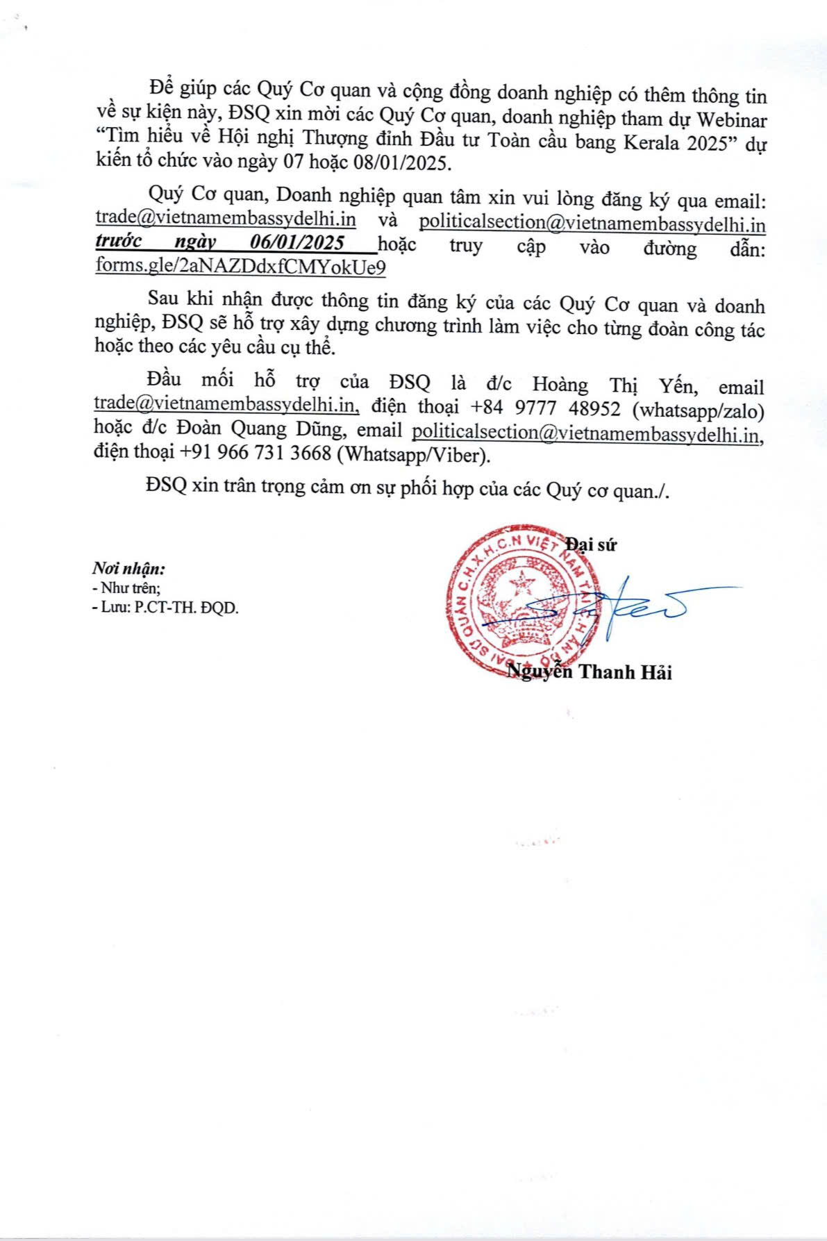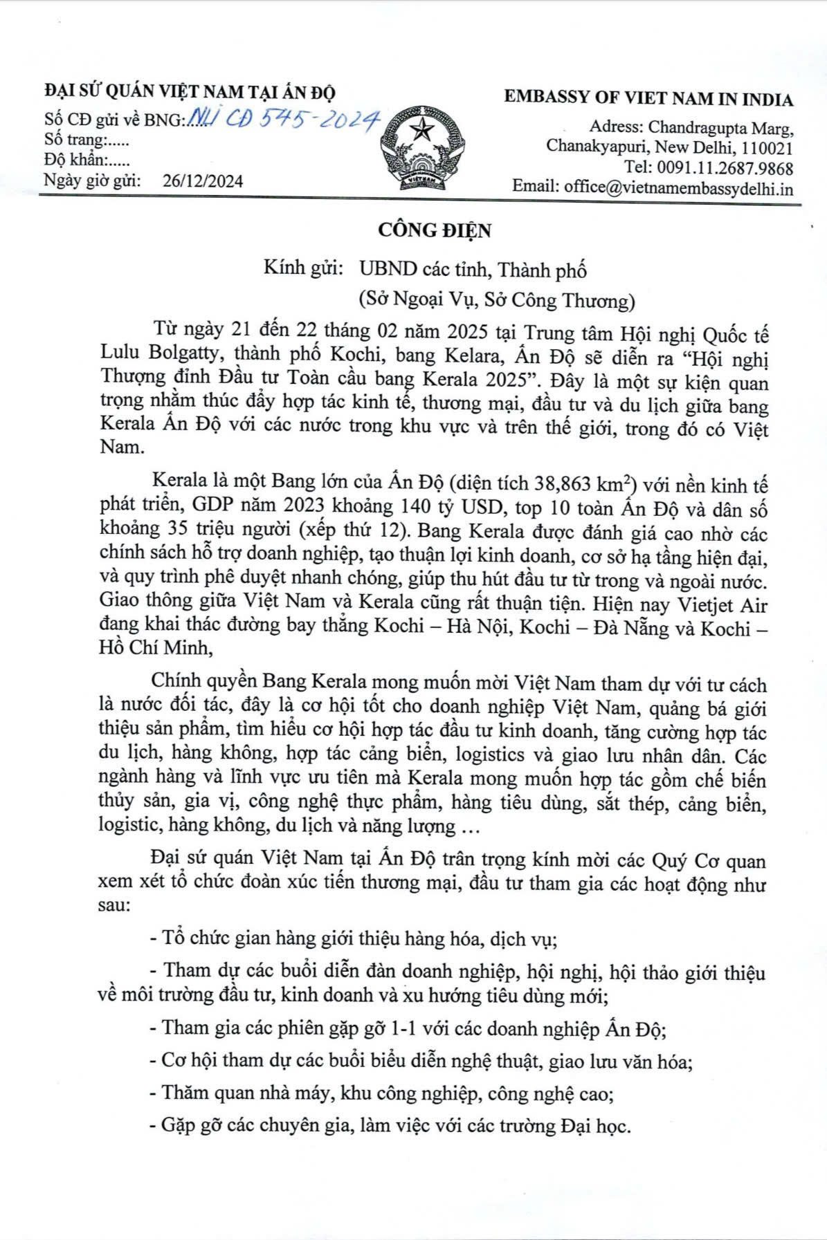 Mời tham dự "Hội nghị Thượng định Đầu tư Toàn cầu bang Kerala 2025"