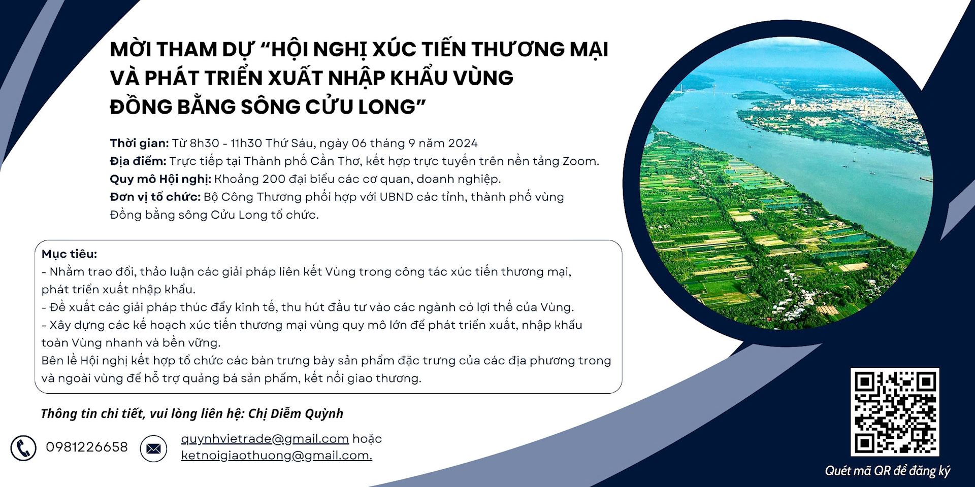 Trân trọng kính mời Quý Doanh nghiệp tham dự Hội nghị “Xúc tiến thương mại và phát triển xuất khẩu vùng Đồng bằng Sông Cửu Long” và tham gia trưng bày sản phẩm kết nối giao thương tại sự kiện
