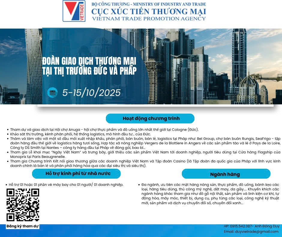 Thực hiện Chương trình cấp quốc gia về xúc tiến thương mại (XTTM) năm 2025 được Bộ trưởng Bộ Công Thương phê duyệt tại Quyết định số 1649/QĐ-BCT ngày 06 tháng 6 năm 2025, Bộ Công Thương chủ trì, Cục XTTM phối hợp với các đơn vị liên quan tổ chức “Đoàn giao dịch thương mại tại thị trường Đức và Pháp”.