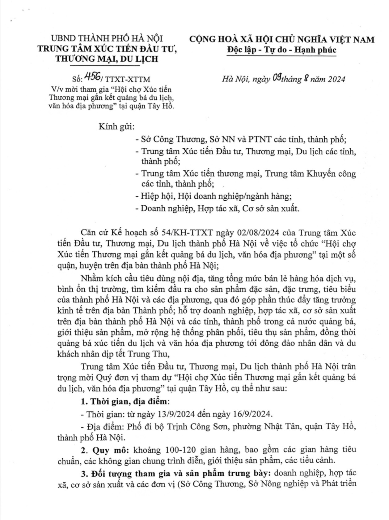Căn cứ Kế hoạch số 54/KH-TTXT ngày 02/08/2024 của Trung tâm Xúc tiến Đầu tư, Thương mại, Du lịch thành phố Hà Nội về việc tổ chức “Hội chợ Xúc tiến Thương mại gắn kết quảng bá du lịch, văn hóa địa phương” tại một số quận, huyện trên địa bàn thành phố Hà Nội;