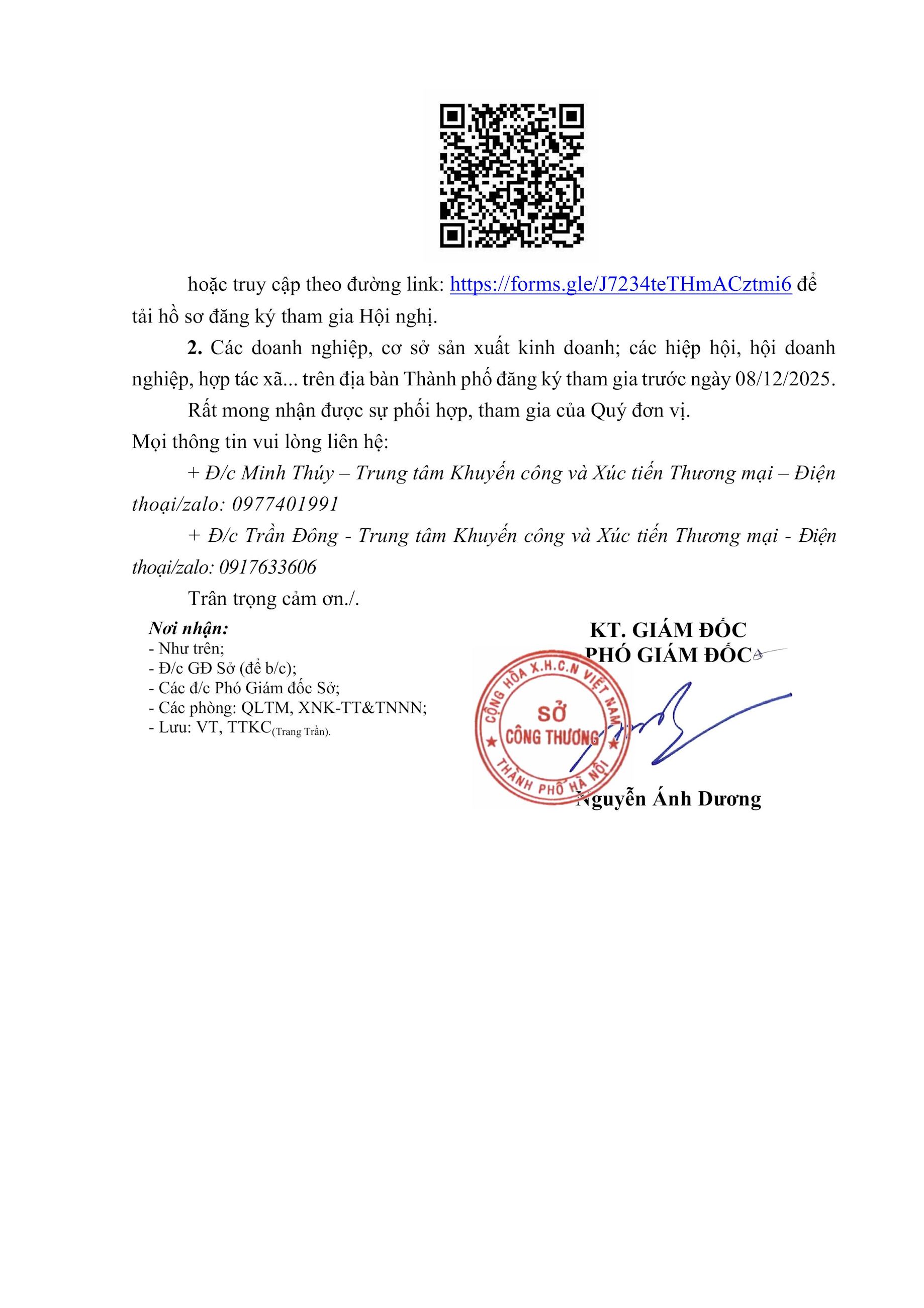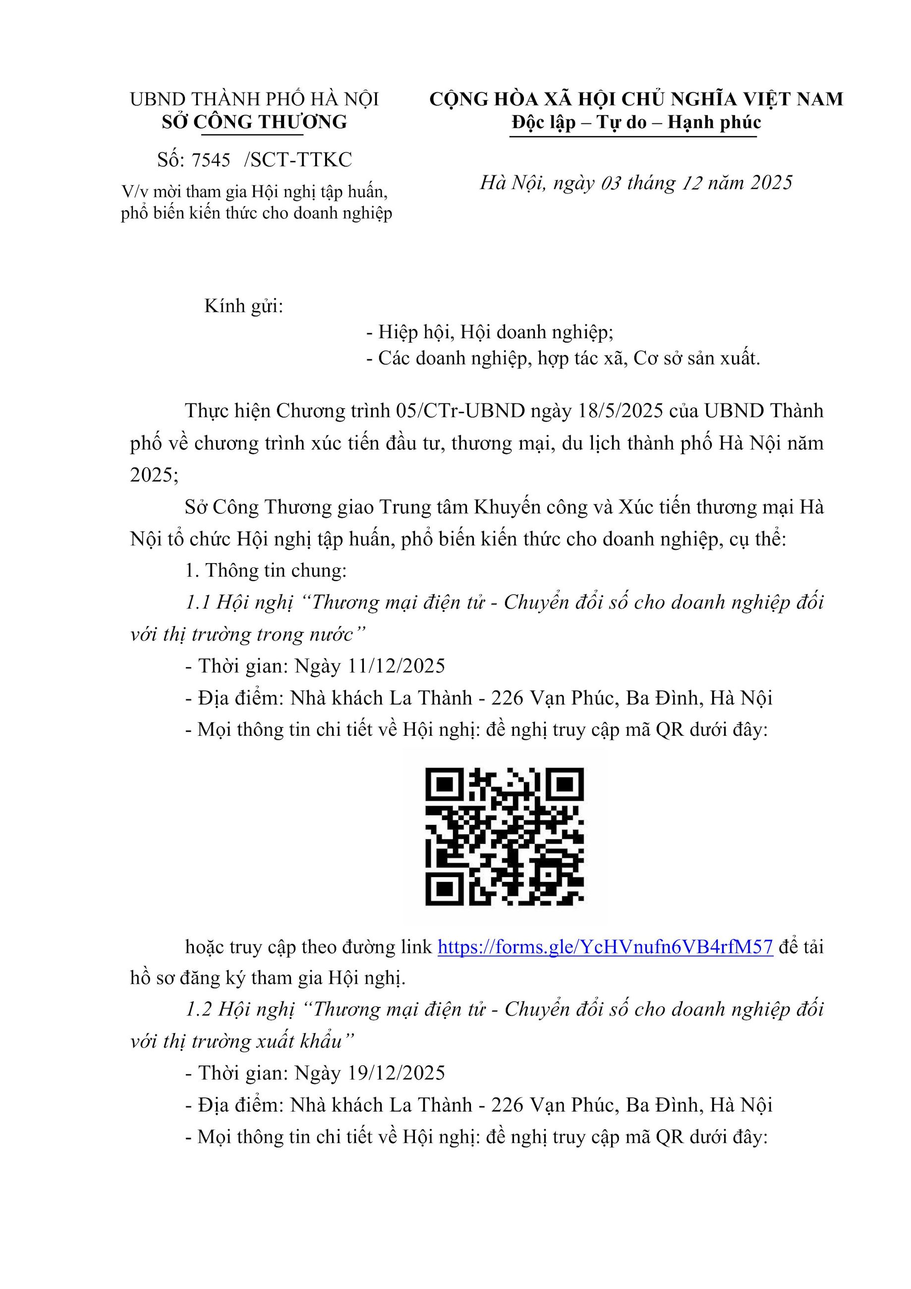 Hội nghị "Thương mại điện tử - Chuyển đổi số cho thị trường trong nước" (ngày 11/12/2025) và Hội nghị "Thương mại điện tử - Chuyển đổi số với thị trường xuất khẩu" (ngày 19/12/2025) do Sở Công Thương Hà Nội giao Trung tâm Khuyến công và Xúc tiến thương mại tổ chức