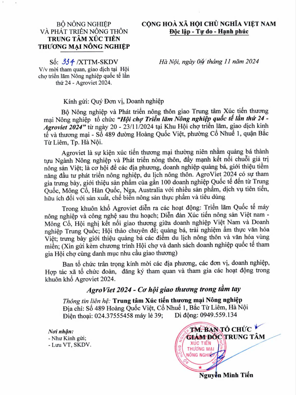 Mời tham quan, giao dịch tại Hội chợ triển lãm Nông nghiệp Quốc tế lần thứ 24 - AgroViet 2024