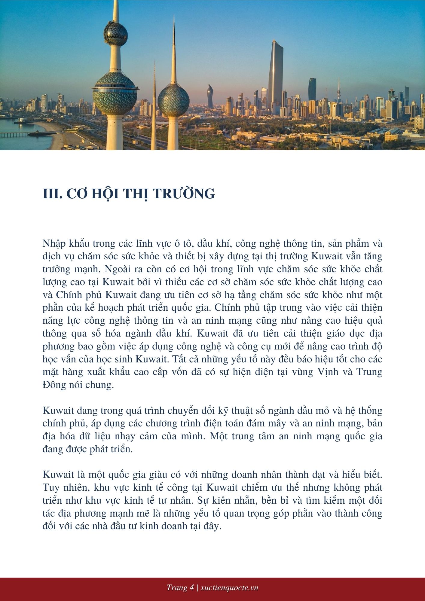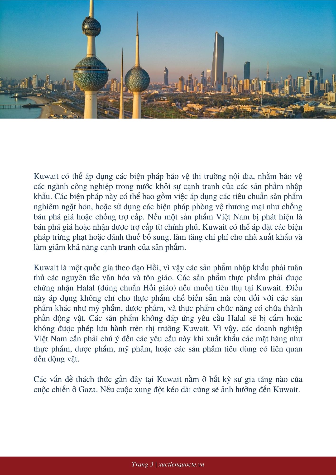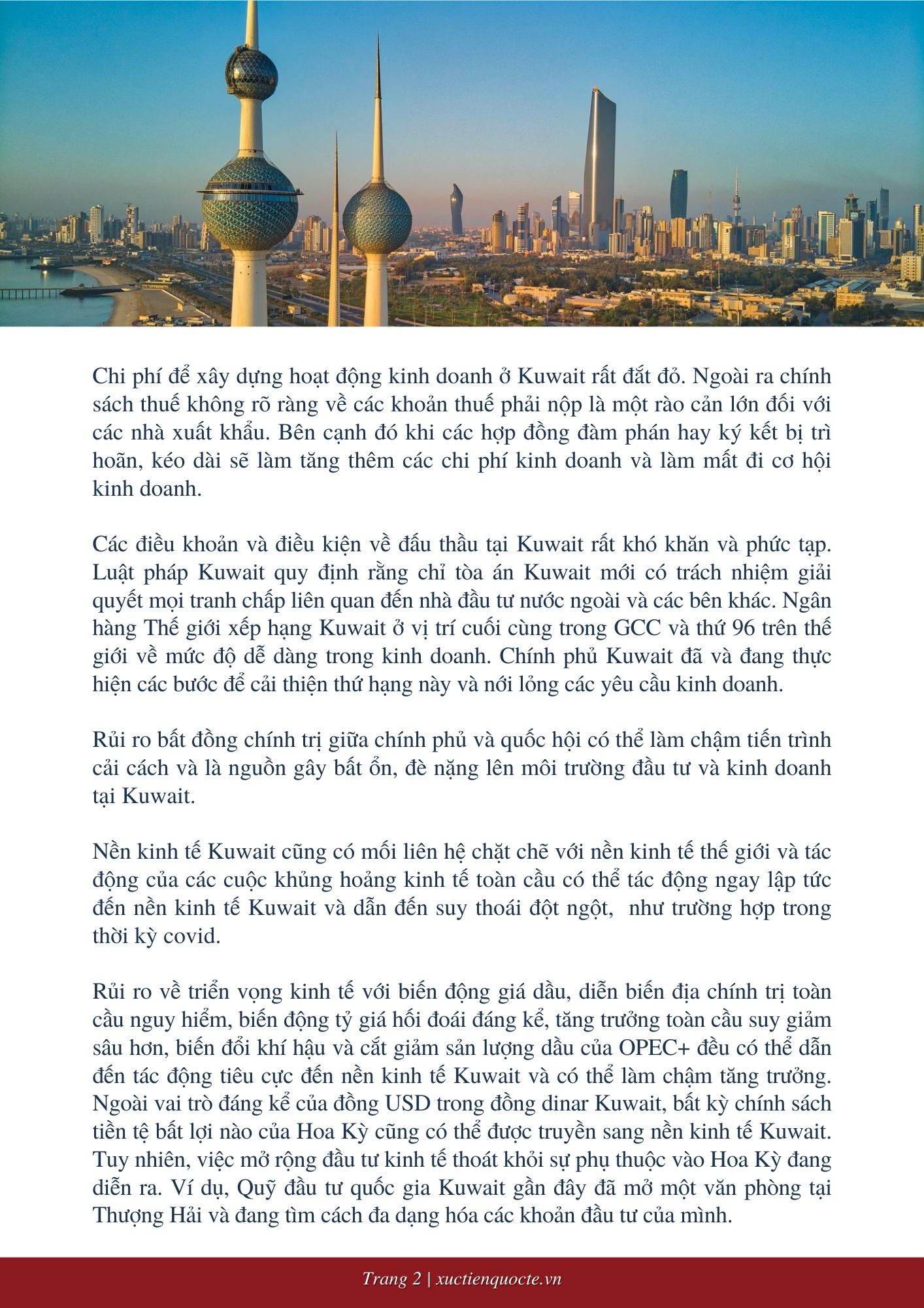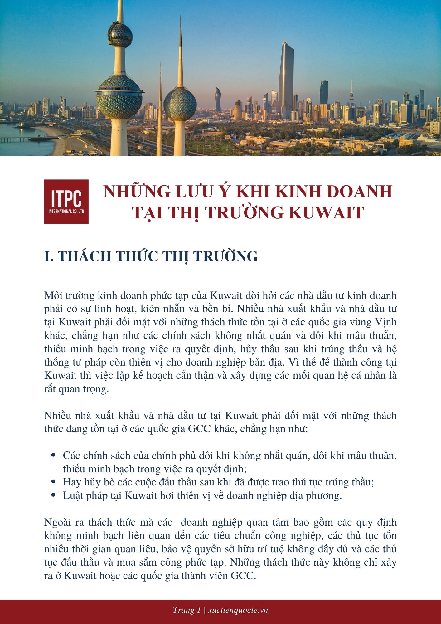 Môi trường kinh doanh phức tạp của Kuwait đòi hỏi các nhà đầu tư kinh doanh phải có sự linh hoạt, kiên nhẫn và bền bỉ. Nhiều nhà xuất khẩu và nhà đầu tư tại Kuwait phải đối mặt với những thách thức tồn tại ở các quốc gia vùng Vịnh khác, chẳng hạn như các chính sách không nhất quán và đôi khi mâu thuẫn, thiếu minh bạch trong việc ra quyết định, hủy thầu sau khi trúng thầu và hệ thống tư pháp còn thiên vị cho doanh nghiệp bản địa. Vì thế để thành công tại Kuwait thì việc lập kế hoạch cẩn thận và xây dựng các mối quan hệ cá nhân là rất quan trọng.