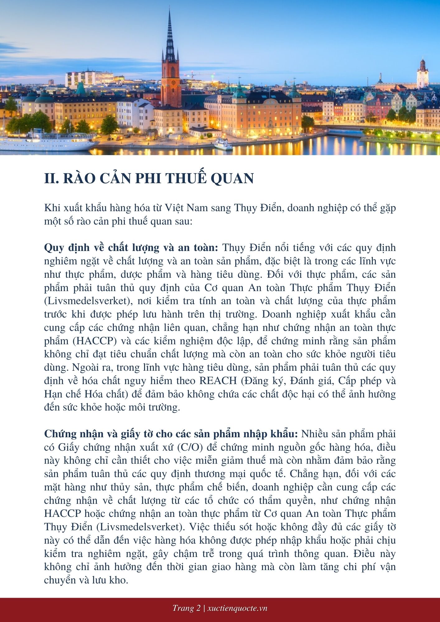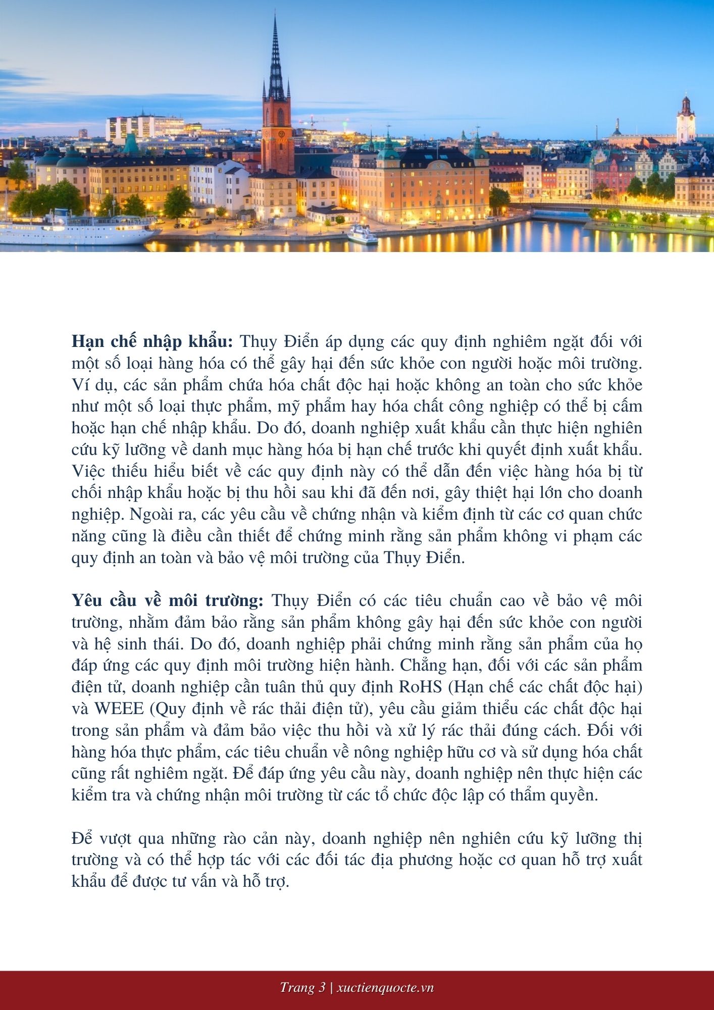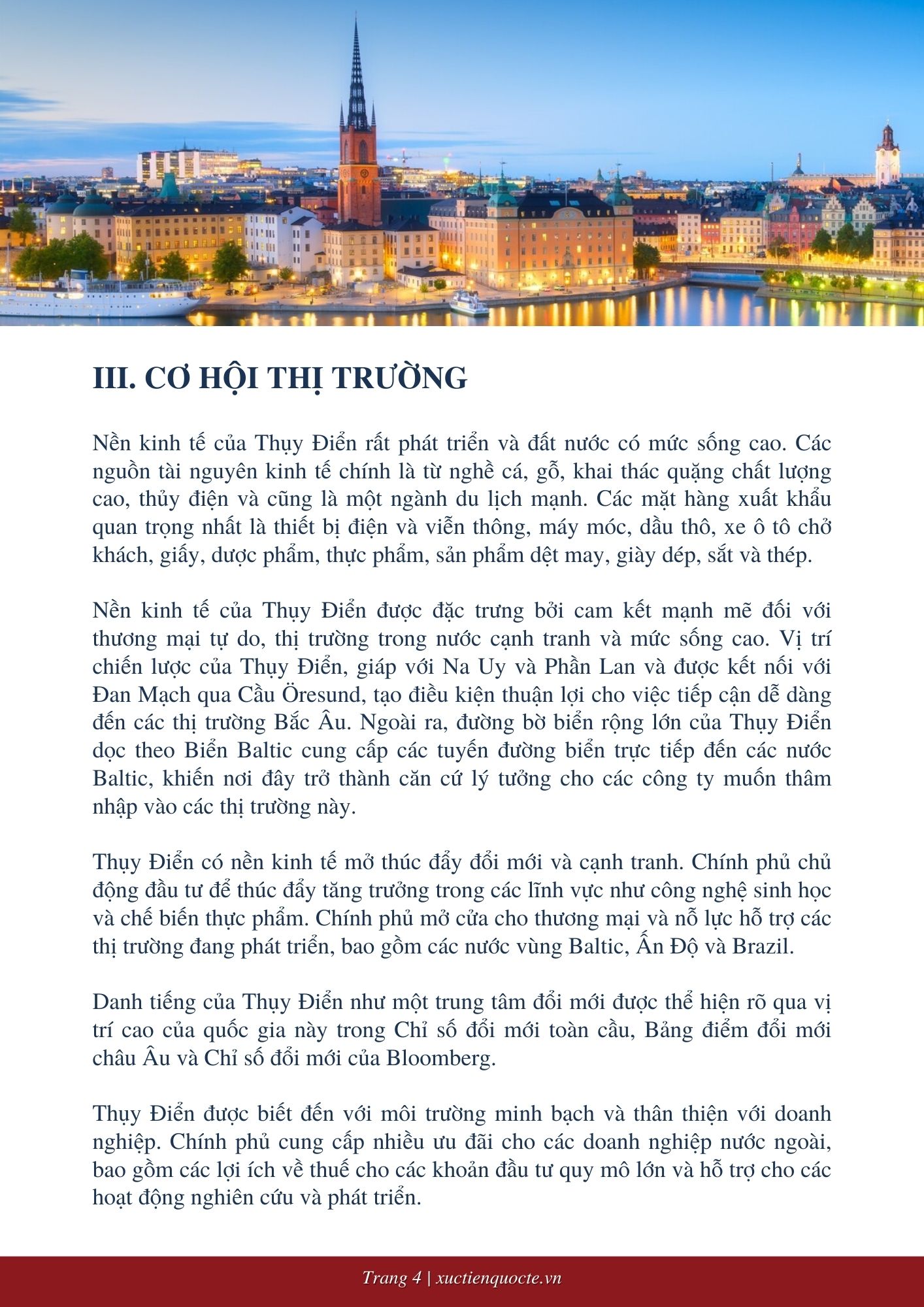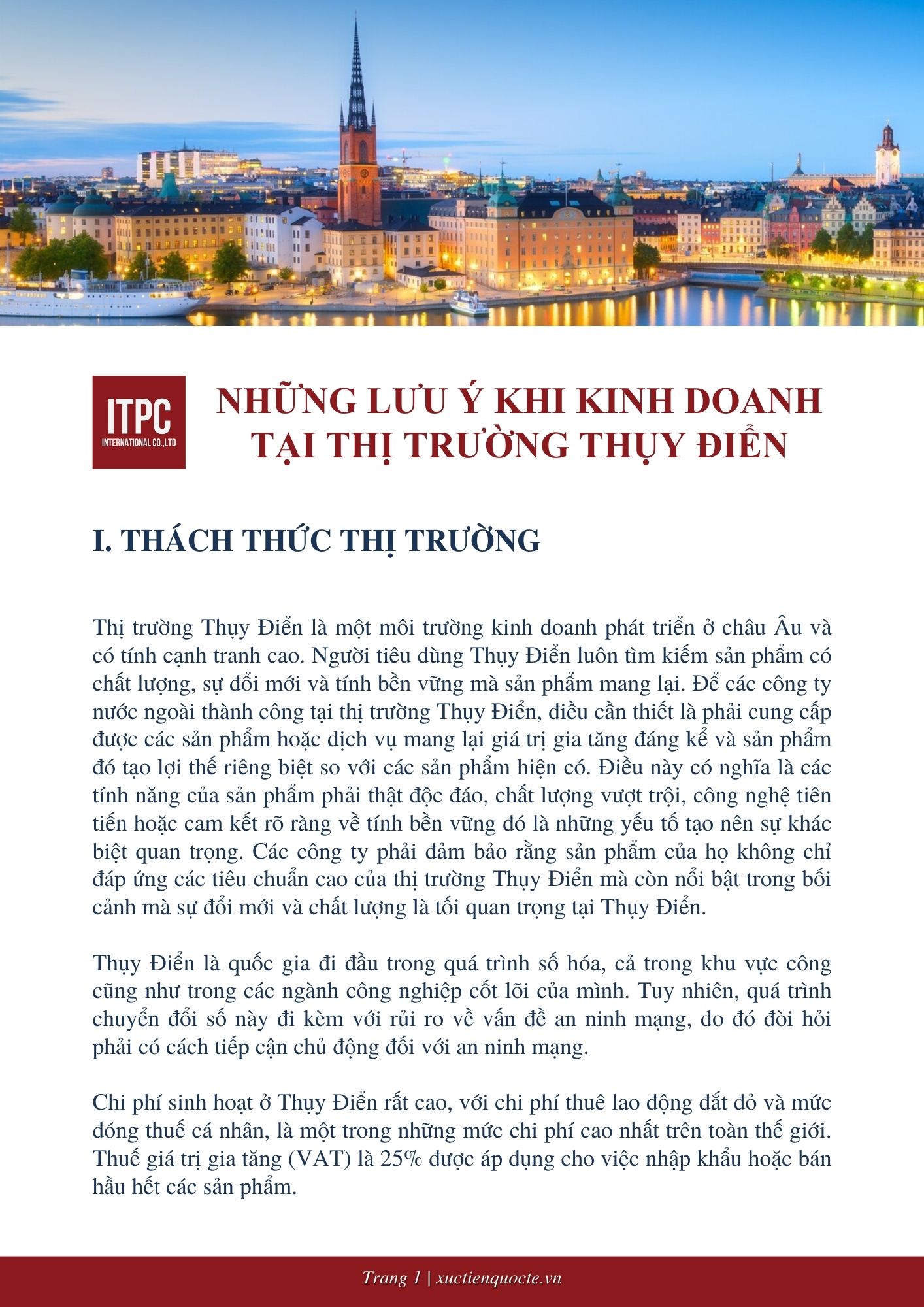 Thị trường Thụy Điển là một môi trường kinh doanh phát triển ở châu Âu và có tính cạnh tranh cao. Người tiêu dùng Thụy Điển luôn tìm kiếm sản phẩm có chất lượng, sự đổi mới và tính bền vững mà sản phẩm mang lại.