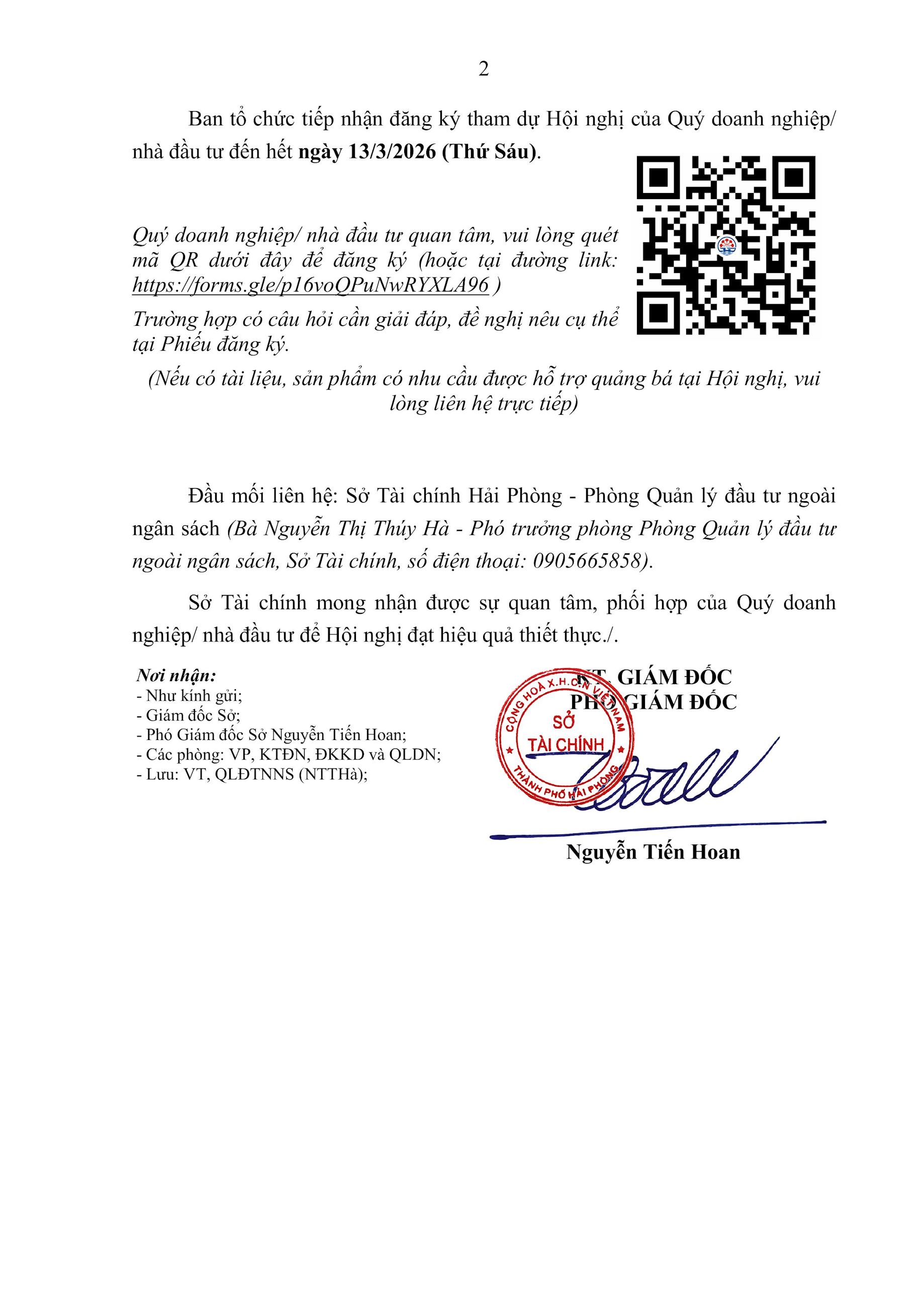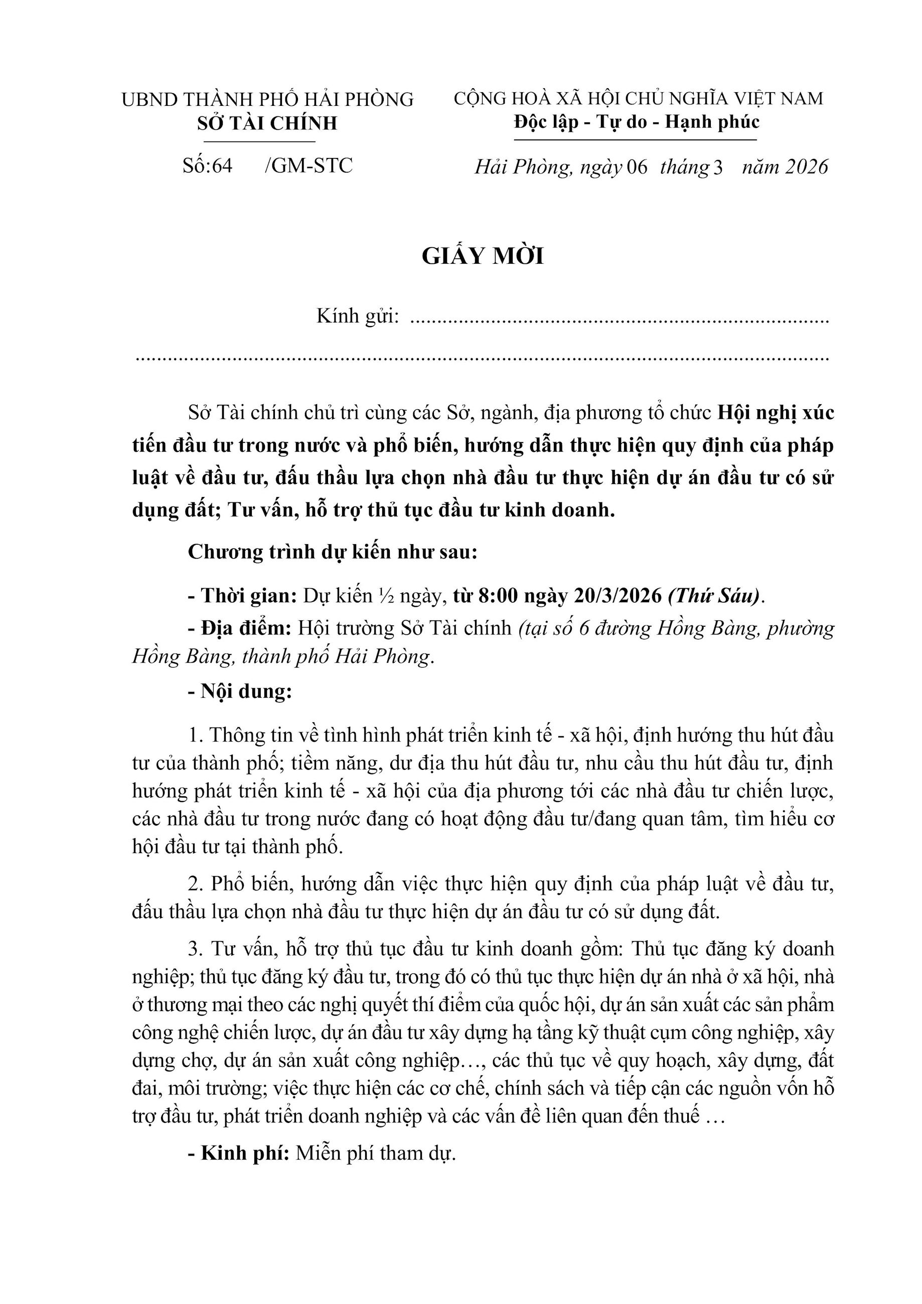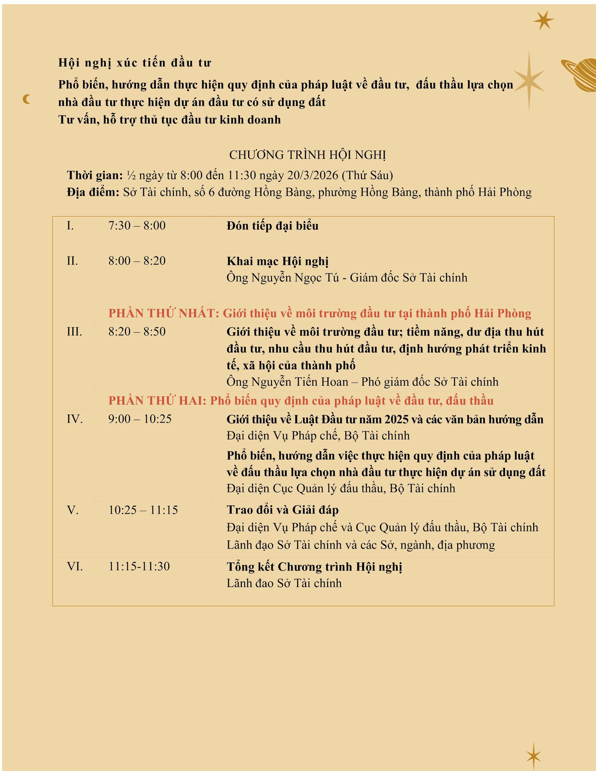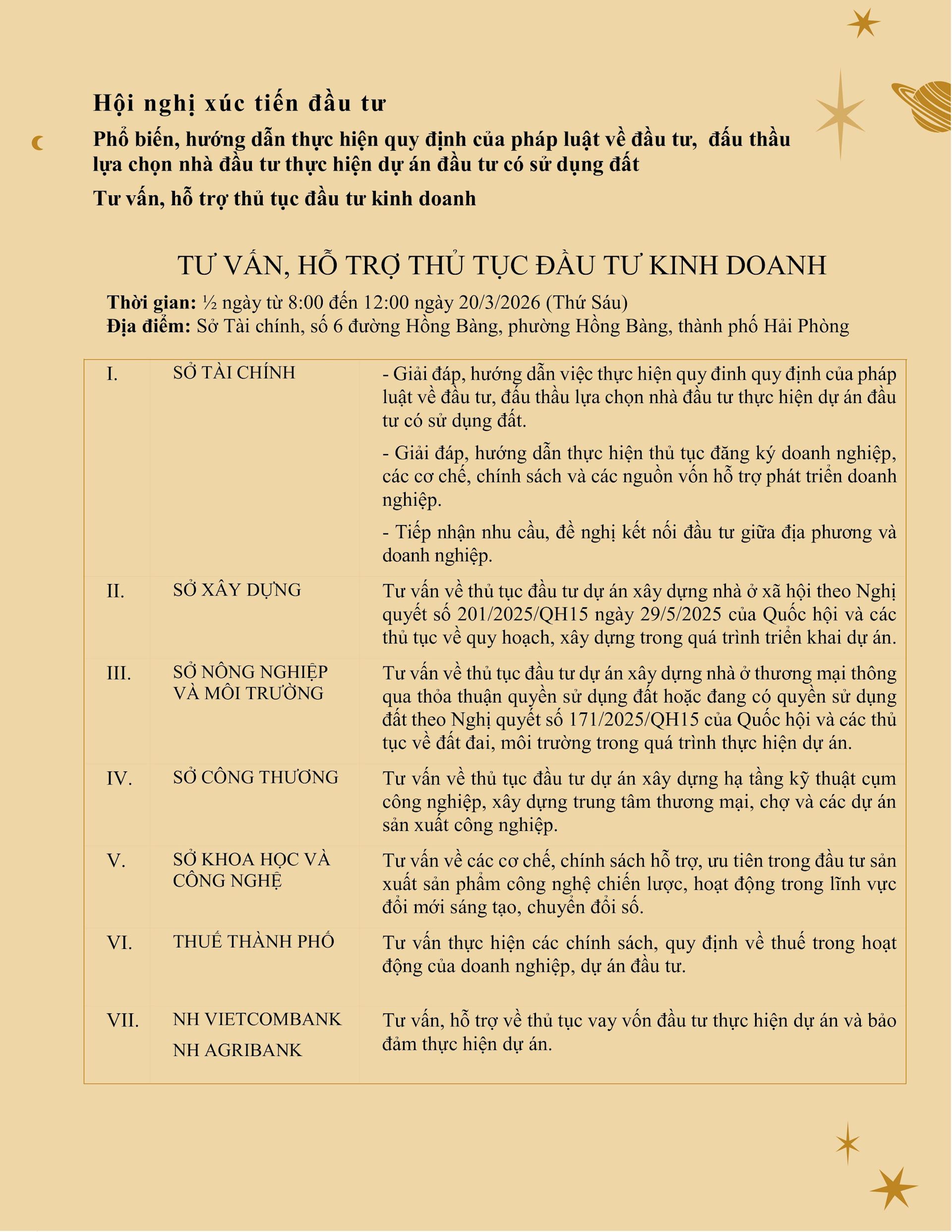 Sở Tài chính Hải Phòng chủ trì cùng các Sở, ngành, địa phương tổ chức Hội nghị Xúc tiến đầu tư trong nước và phổ biến, hướng dẫn thực hiện quy định của pháp luật về đầu tư, đấu thầu lựa chọn nhà đầu tư thực hiện dự án đầu tư có sử dụng đất; Tư vấn, hỗ trợ thủ tục đầu tư kinh doanh