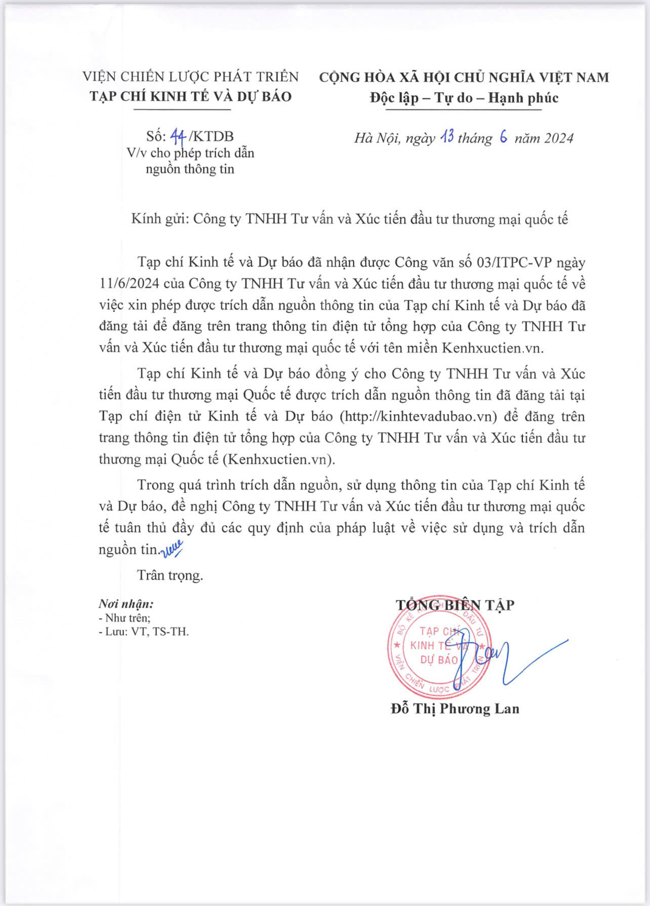 Tạp chí Kinh tế và Dự báo cho phép trích dẫn nguồn tin