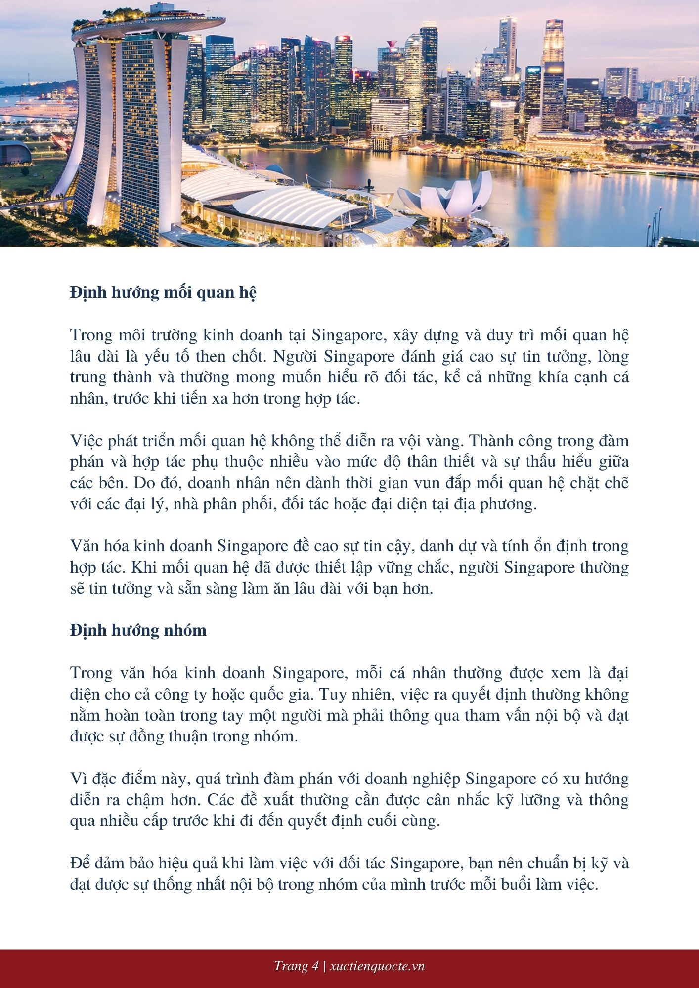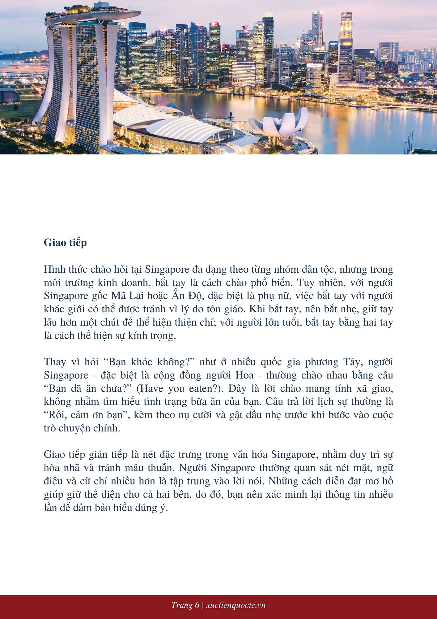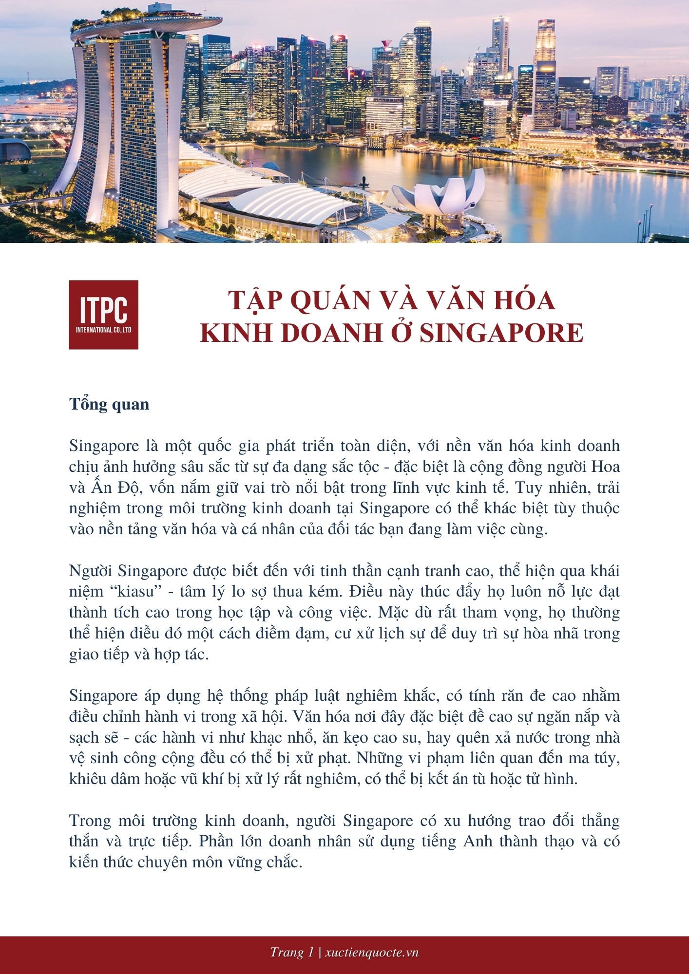 Singapore là một quốc gia phát triển toàn diện, với nền văn hóa kinh doanh chịu ảnh hưởng sâu sắc từ sự đa dạng sắc tộc - đặc biệt là cộng đồng người Hoa và Ấn Độ, vốn nắm giữ vai trò nổi bật trong lĩnh vực kinh tế. Tuy nhiên, trải nghiệm trong môi trường kinh doanh tại Singapore có thể khác biệt tùy thuộc vào nền tảng văn hóa và cá nhân của đối tác bạn đang làm việc cùng.