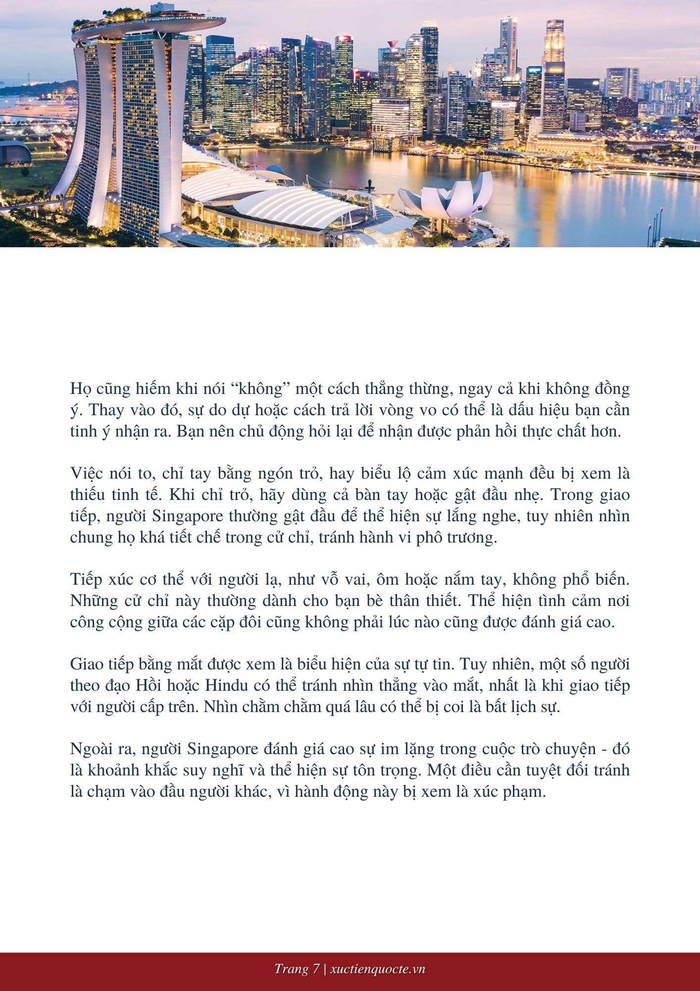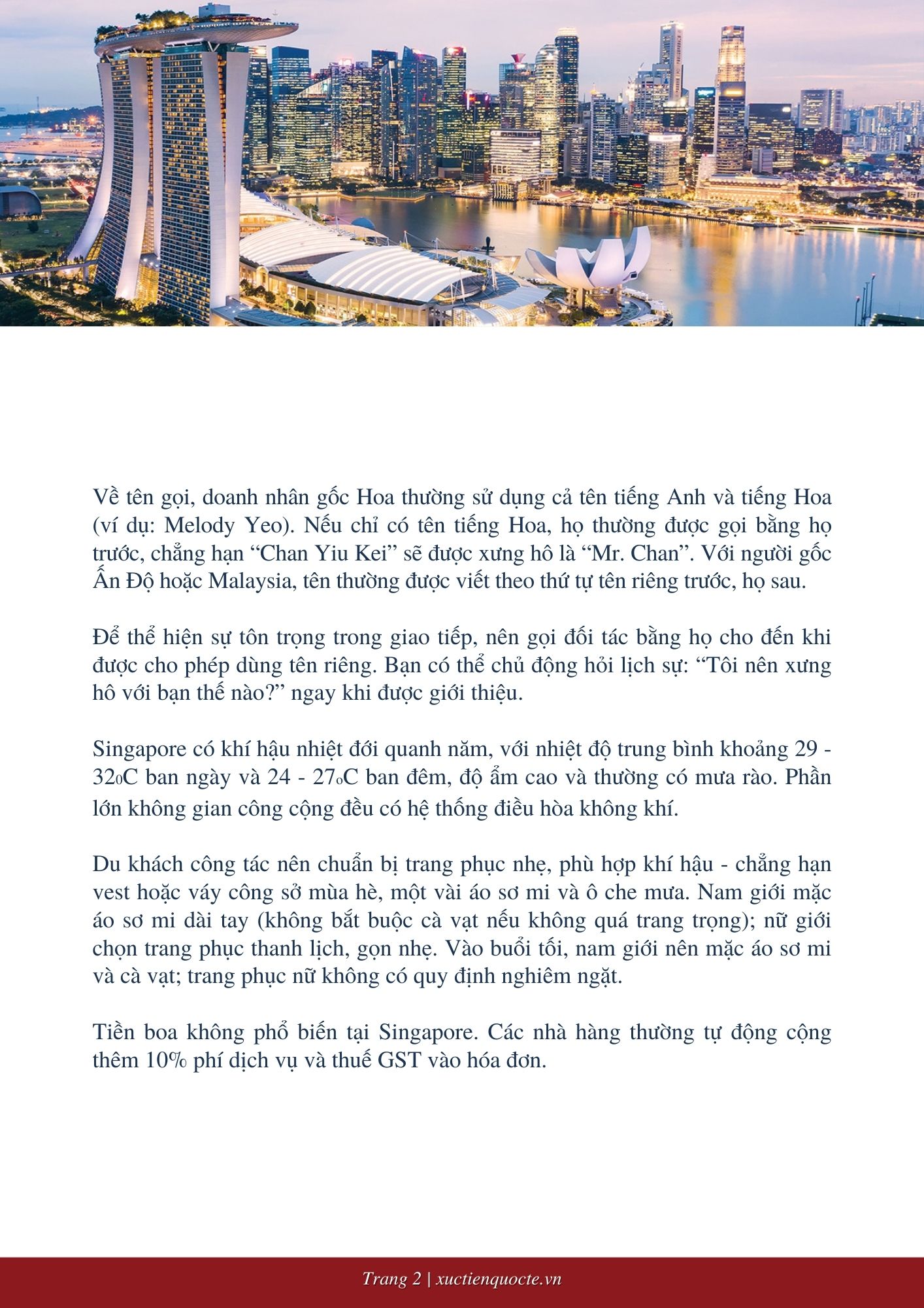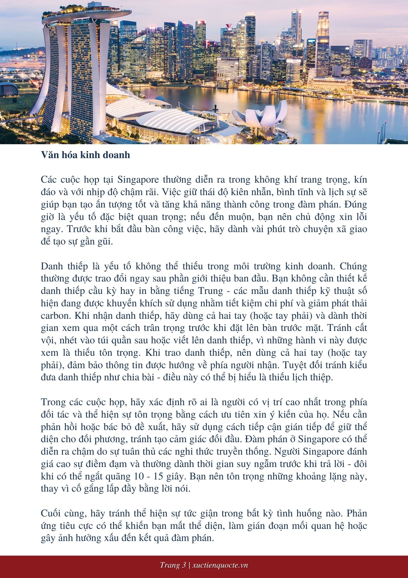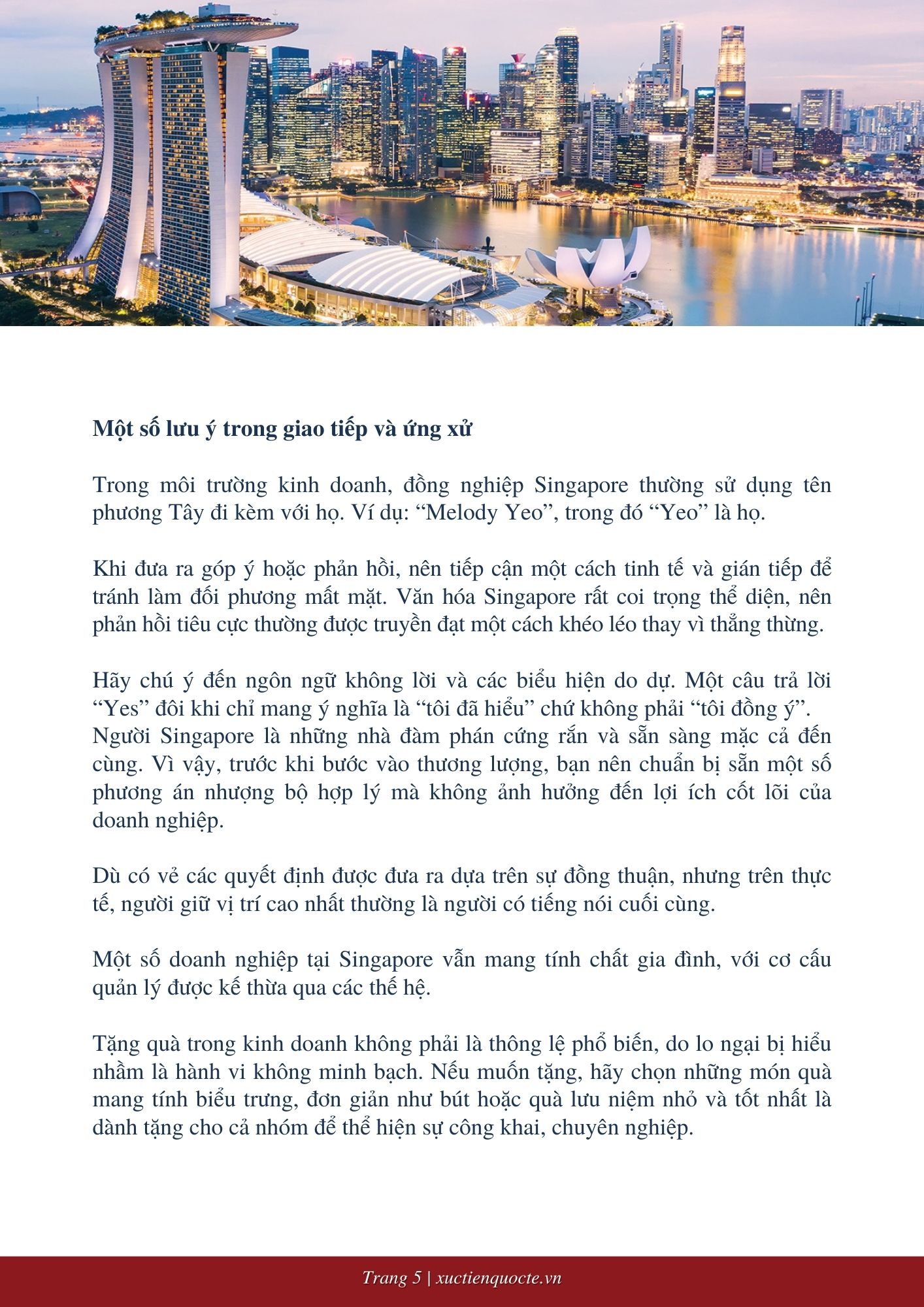Singapore là một quốc gia phát triển toàn diện, với nền văn hóa kinh doanh chịu ảnh hưởng sâu sắc từ sự đa dạng sắc tộc - đặc biệt là cộng đồng người Hoa và Ấn Độ, vốn nắm giữ vai trò nổi bật trong lĩnh vực kinh tế. Tuy nhiên, trải nghiệm trong môi trường kinh doanh tại Singapore có thể khác biệt tùy thuộc vào nền tảng văn hóa và cá nhân của đối tác bạn đang làm việc cùng.