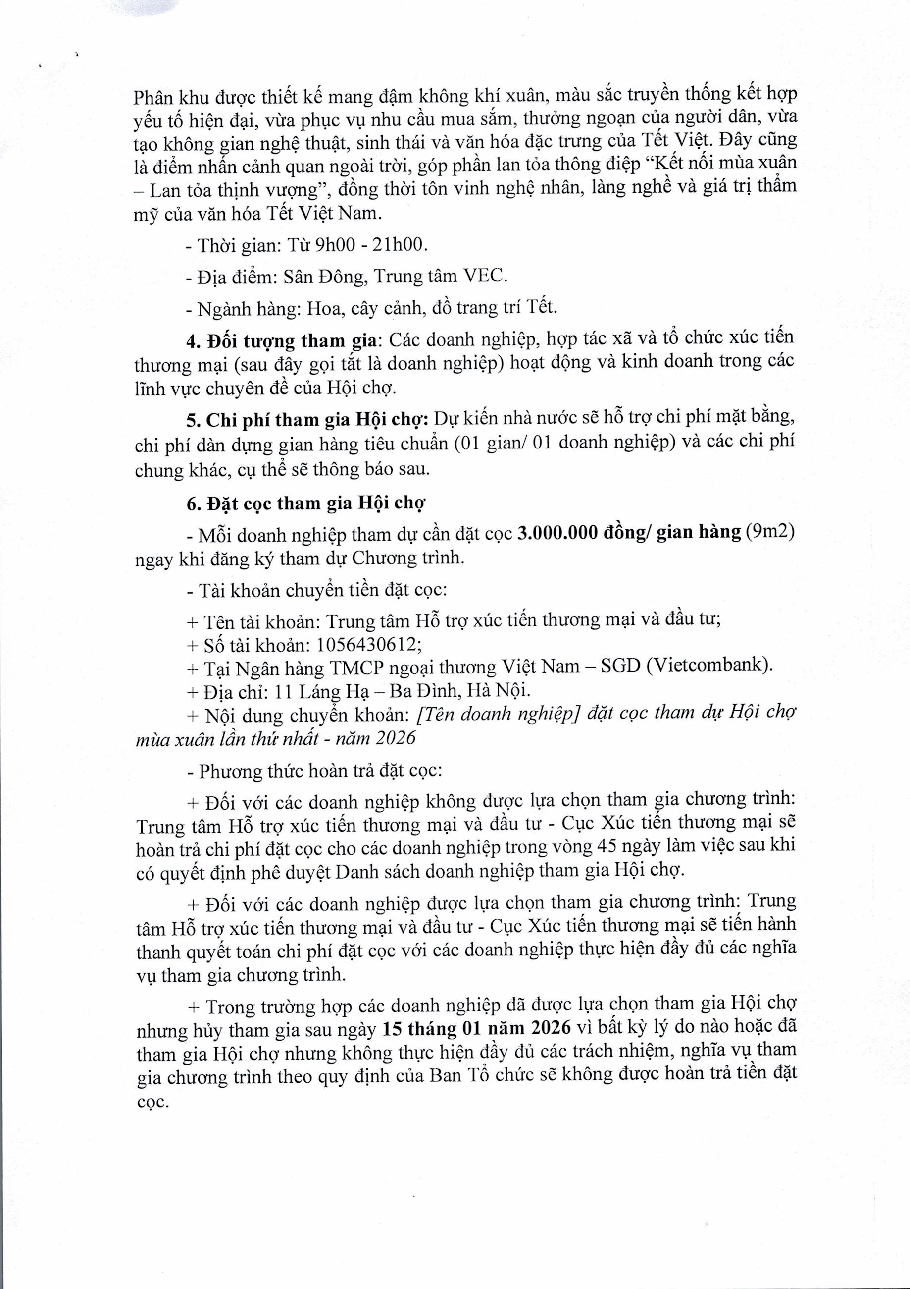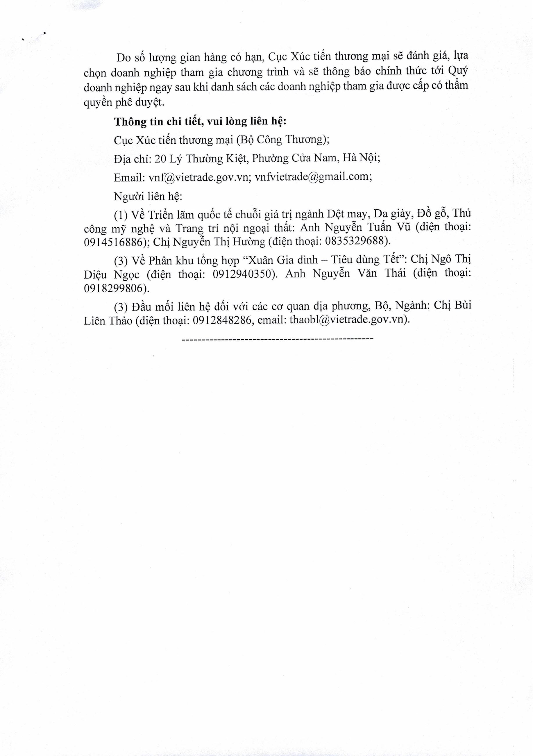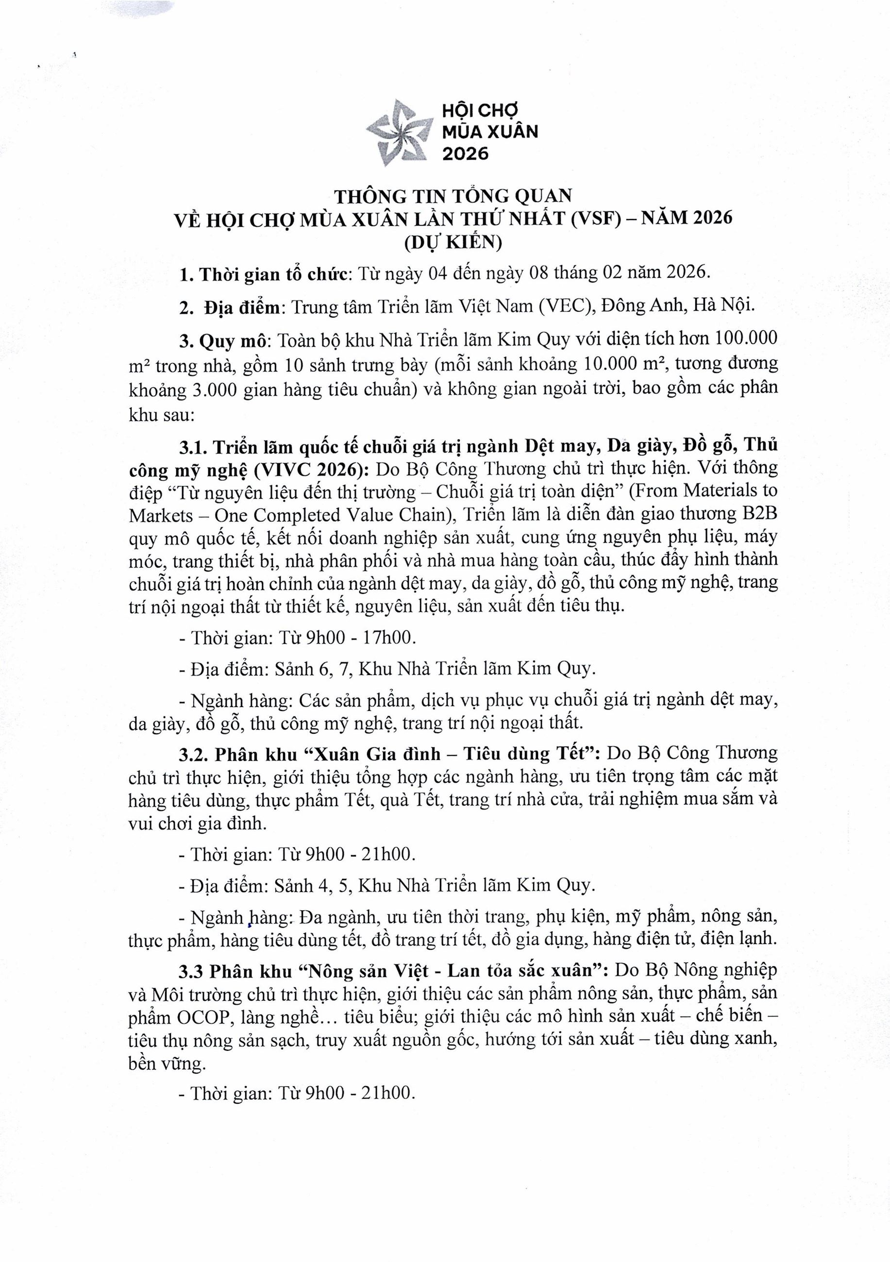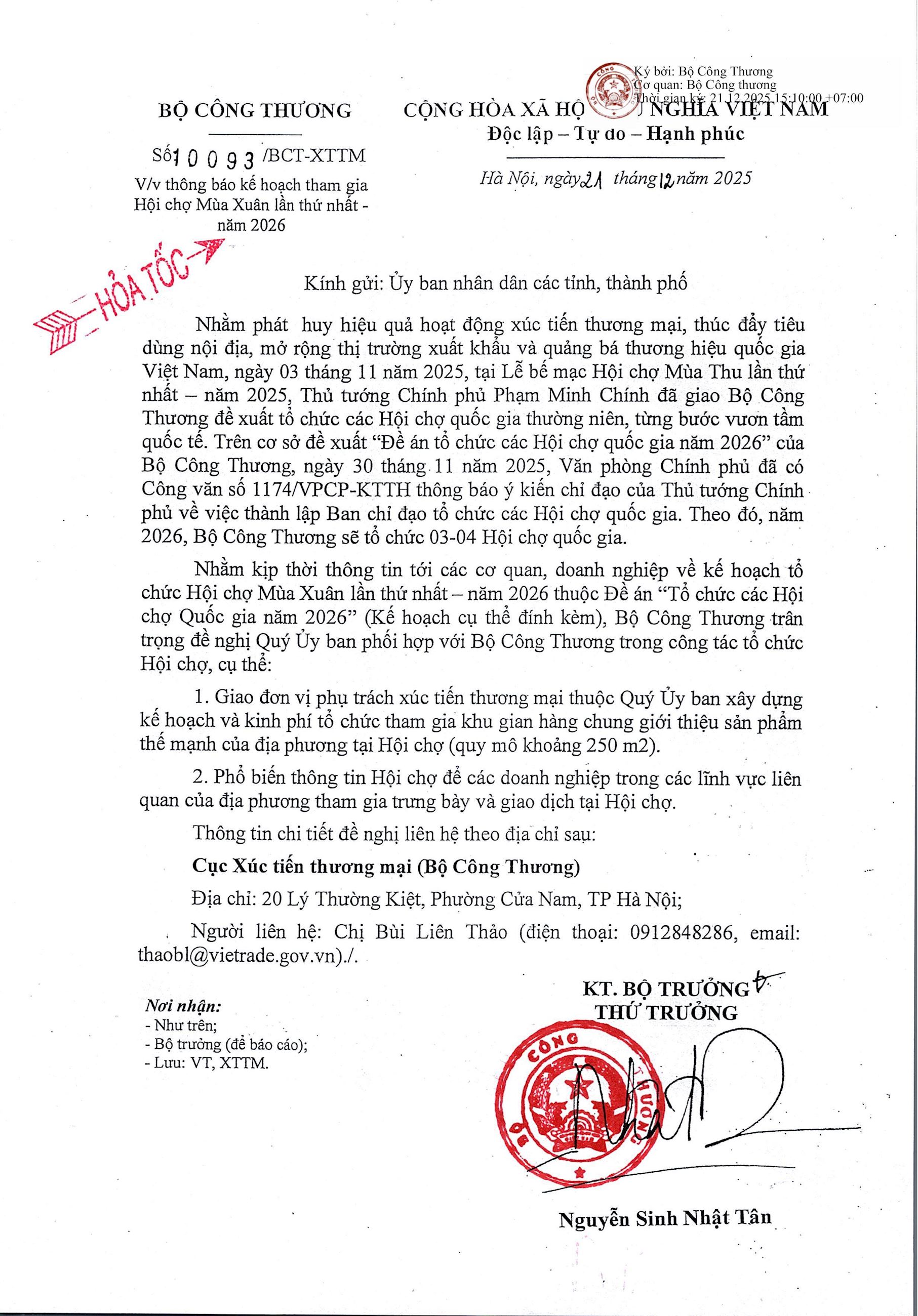 Công văn số 10093/BCT-XTTM ngày 21/12/2025 của Bộ Công Thương về việc thông báo kế hoạch tham gia Hội chợ Mùa Xuân lần thứ nhất năm 2026 xem tại đây