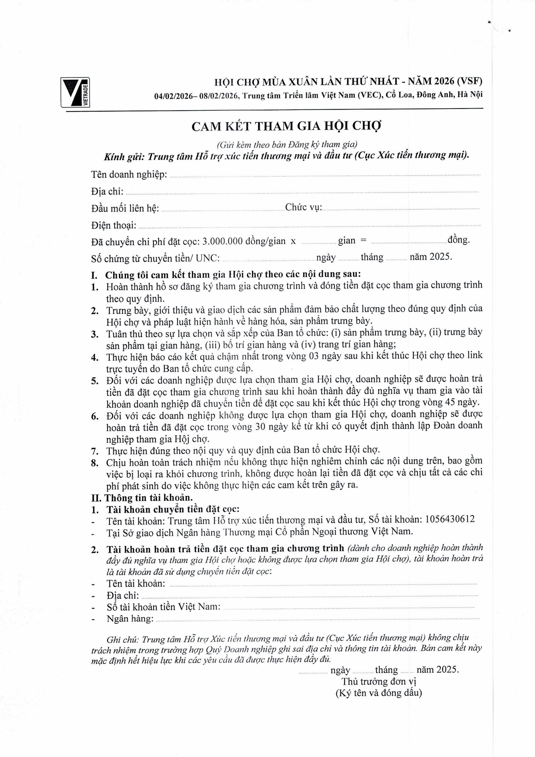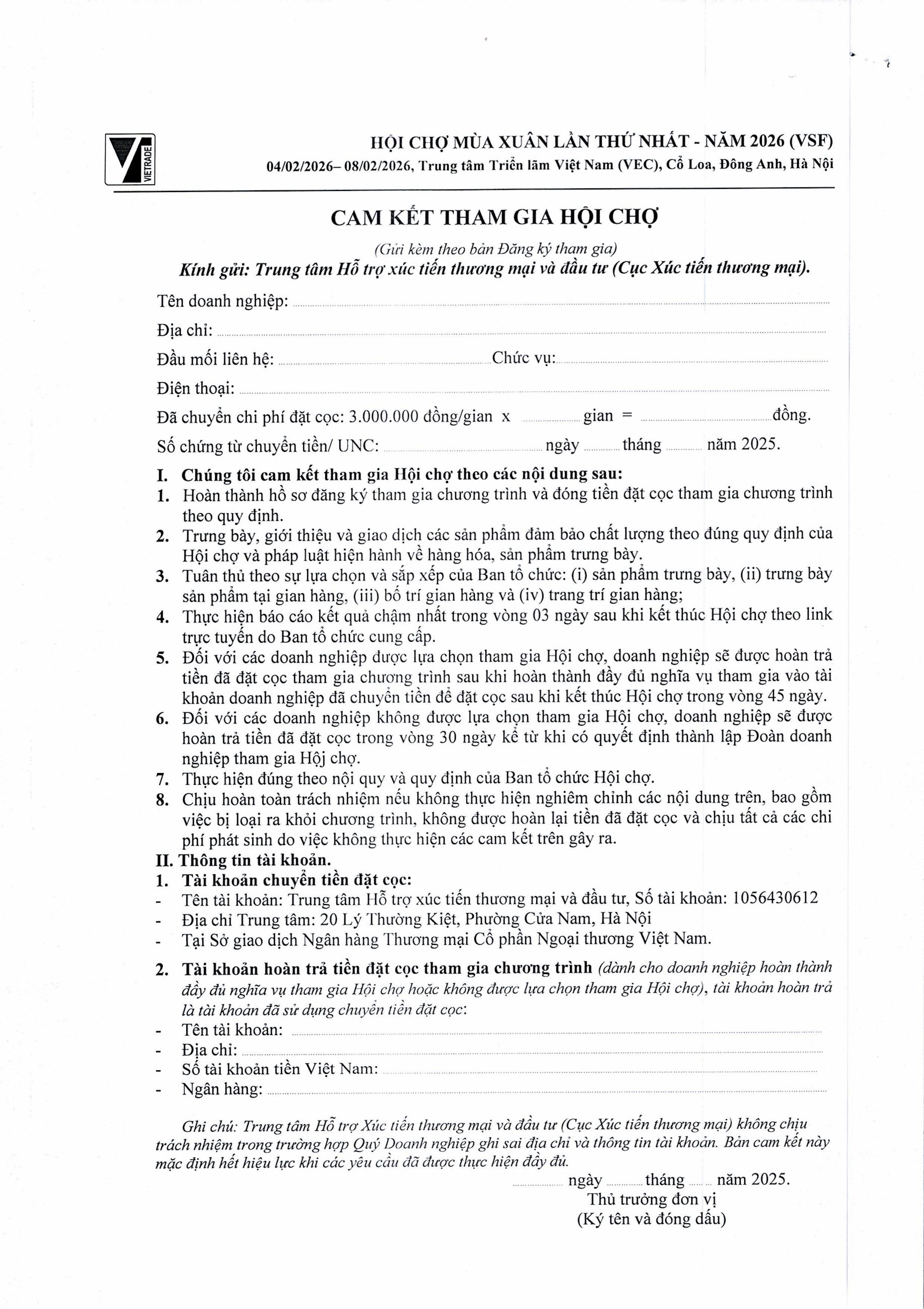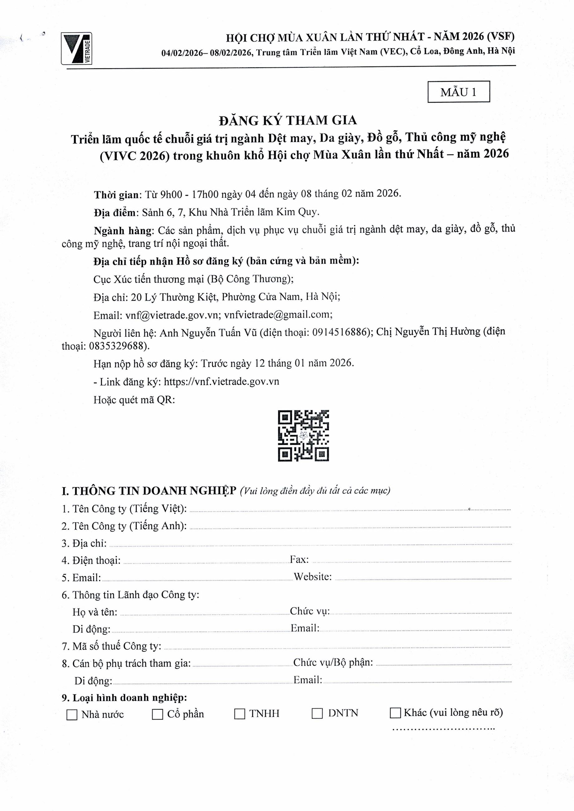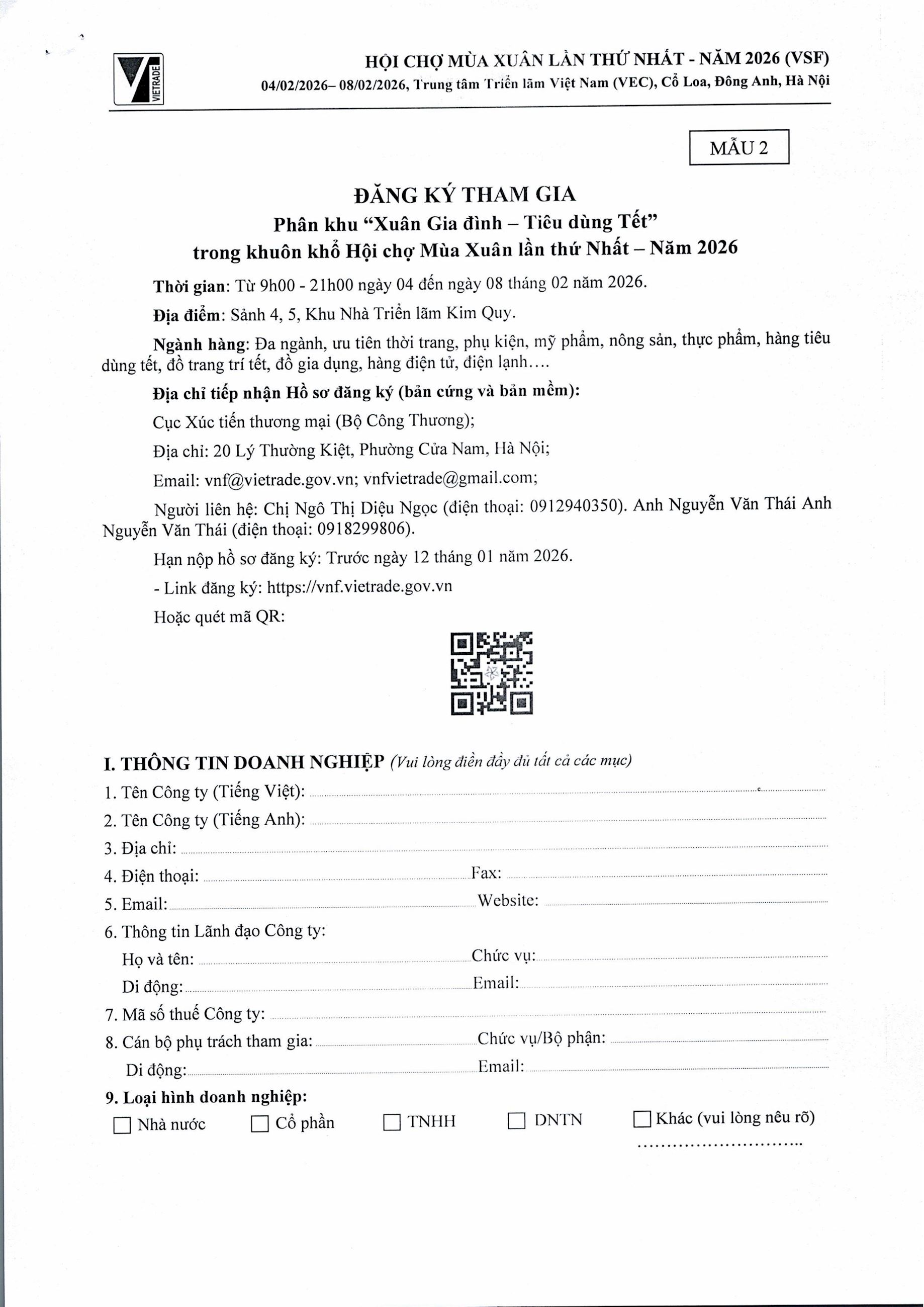 Công văn số 10093/BCT-XTTM ngày 21/12/2025 của Bộ Công Thương về việc thông báo kế hoạch tham gia Hội chợ Mùa Xuân lần thứ nhất năm 2026 xem tại đây