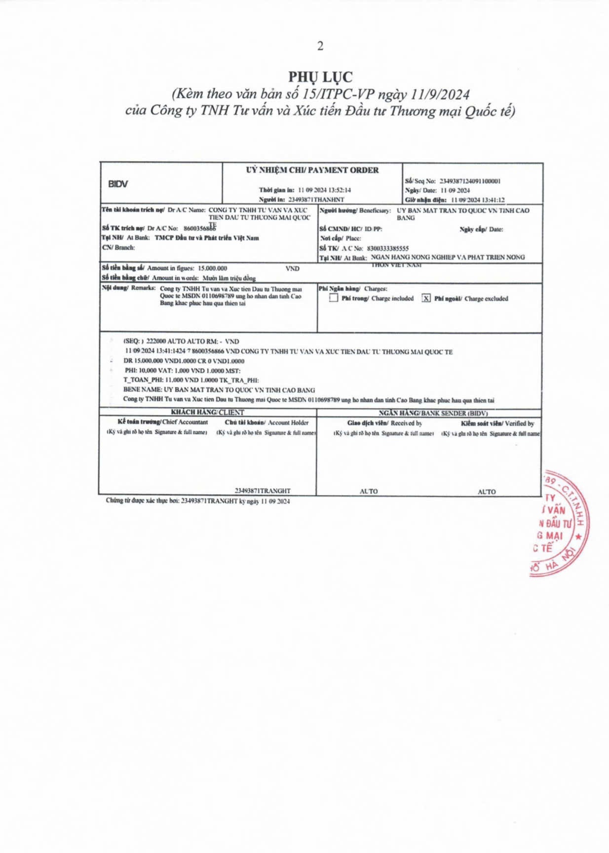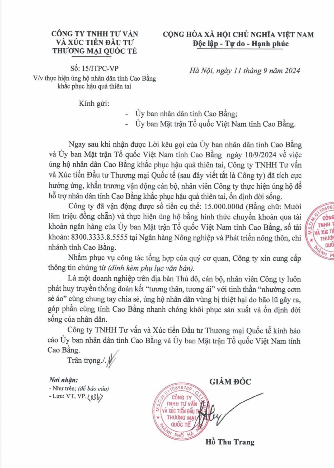 Ngay sau khi nhận được Lời kêu gọi của Ủy ban nhân dân tỉnh Cao Bằng và Ủy ban Mặt trận Tổ quốc Việt Nam tỉnh Cao Bằng ngày 10/9/2024 về việc ủng hộ nhân dân Cao Bằng khắc phục hậu quả thiên tai, Công ty TNHH Tư vấn và Xúc tiến Đầu tư Thương mại Quốc tế đã tích cực hưởng ứng, khẩn trương vận động cán bộ, nhân viên Công ty thực hiện ủng hộ để hỗ trợ nhân dân tỉnh Cao Bằng khắc phục hậu quả thiên tai, ổn định đời sống...