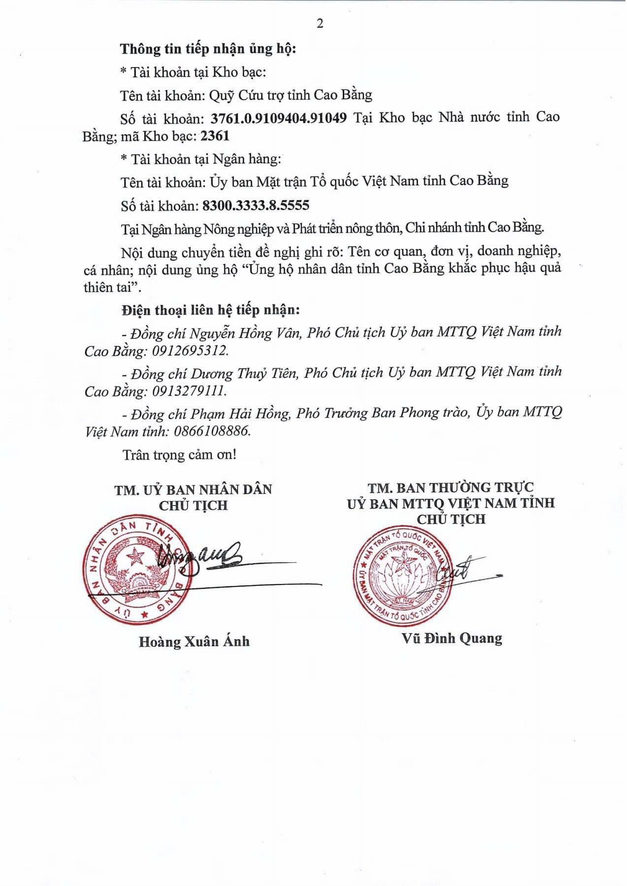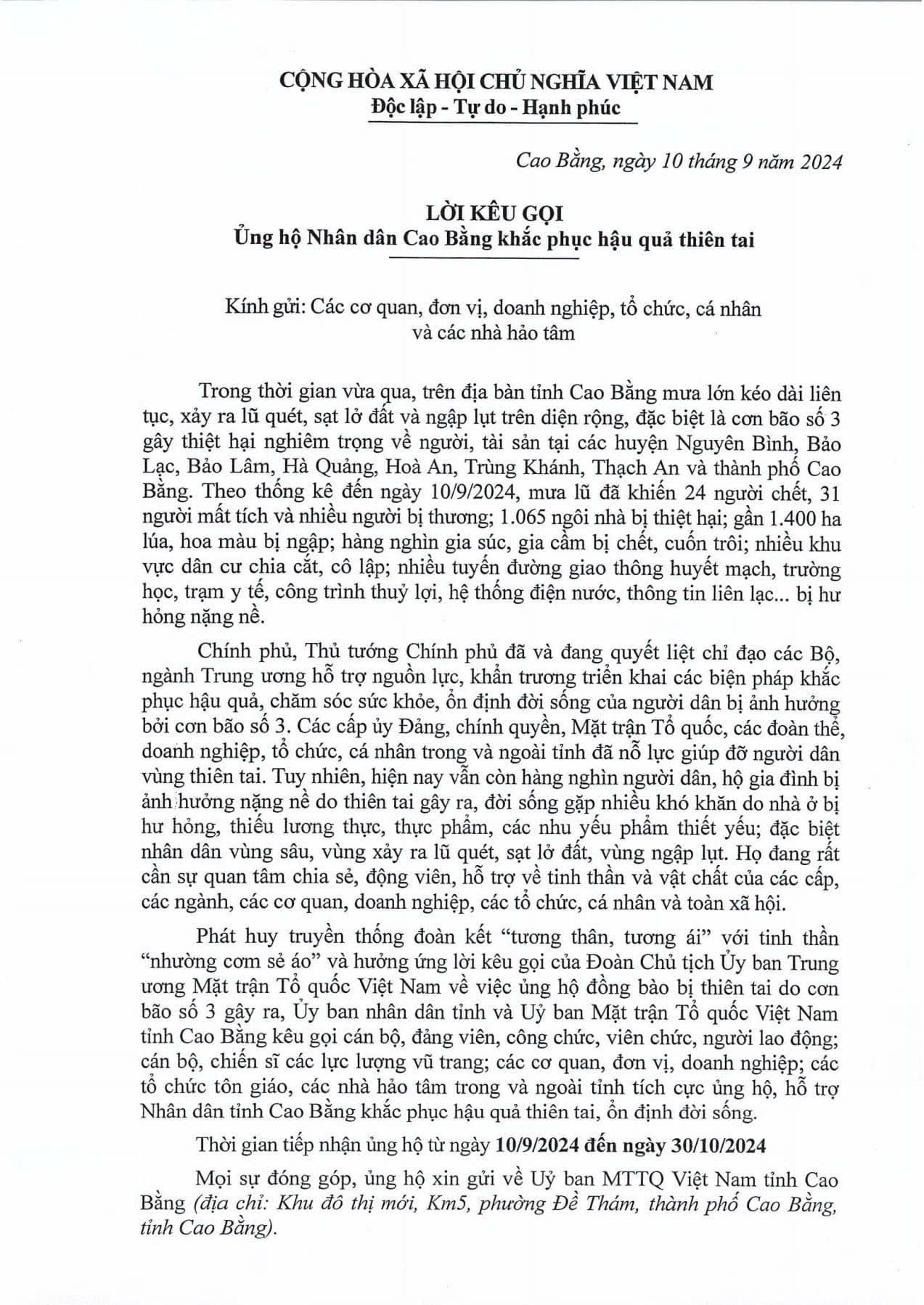 Toàn văn lời kêu gọi ủng hộ nhân dân Cao Bằng khắc phục hậu quả thiên tai ngày 10/9/2024 của UBND tỉnh Cao Bằng và UBMTTQVN tỉnh Cao Bằng: