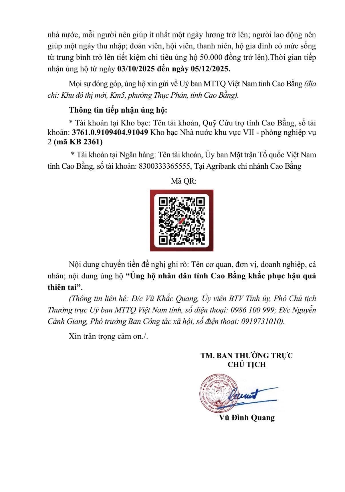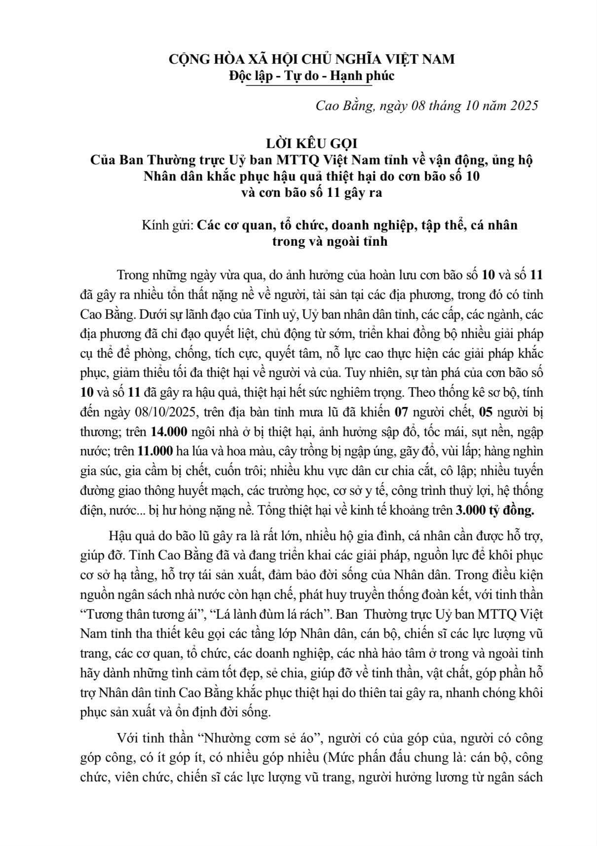 Tin liên quan: Thực hiện ủng hộ nhân dân tỉnh Cao Bằng khắc phục hậu quả của thiên tai (cơn bão số 3 - Yagi)