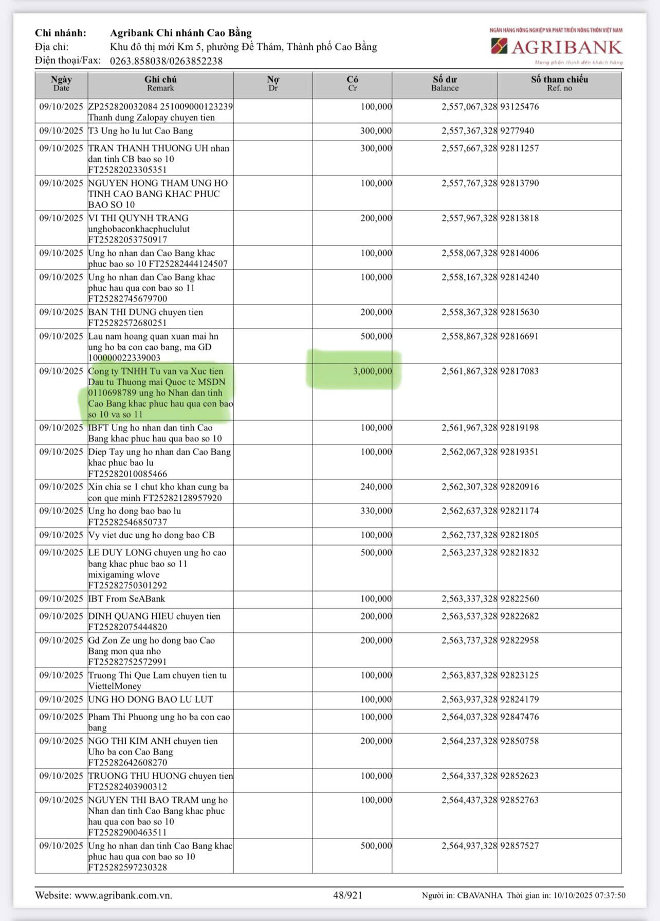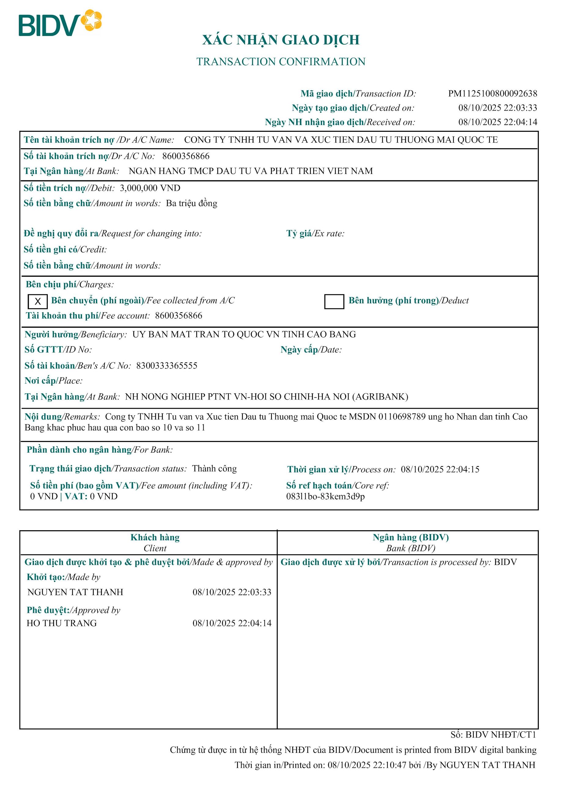 Công ty TNHH Tư vấn và Xúc tiến Đầu tư Thương mại Quốc tế đã vận động được số tiền 3.000.000đ (Bằng chữ: Ba triệu đồng) và thực hiện ủng hộ bằng hình thức chuyển khoản vào tài khoản ngân hàng của Ủy ban Mặt trận Tổ quốc Việt Nam tỉnh Cao Bằng, số tài khoản: 8300333365555 tại Ngân hàng Nông nghiệp và Phát triển Nông thôn Việt Nam (Agribank).