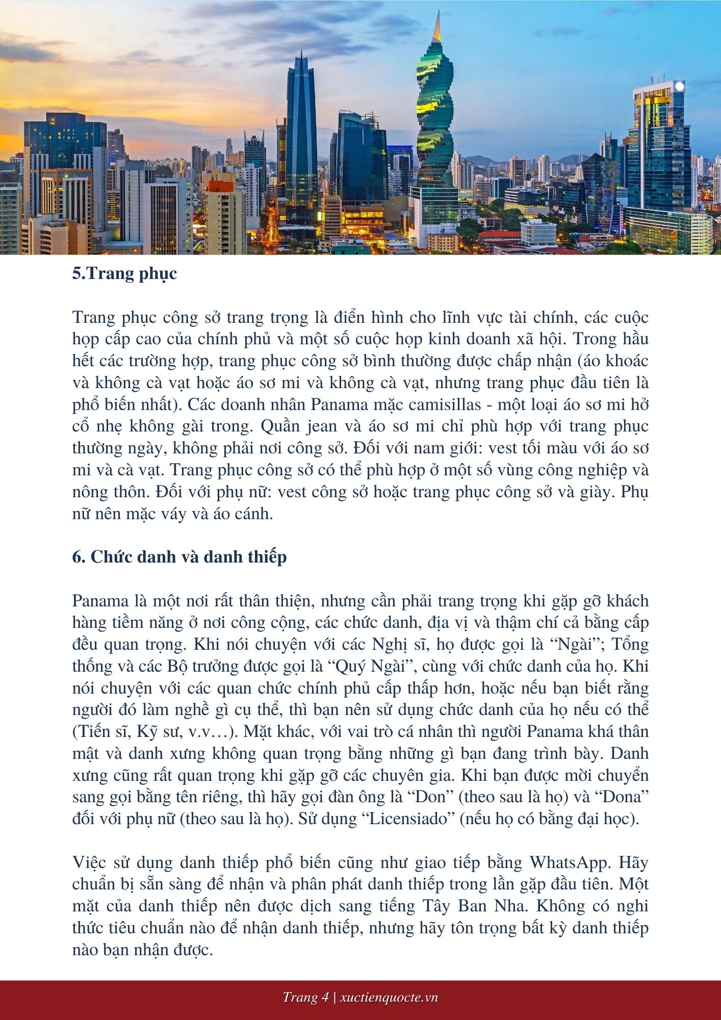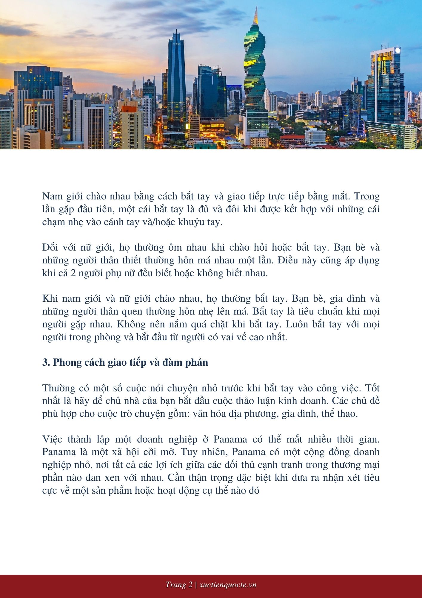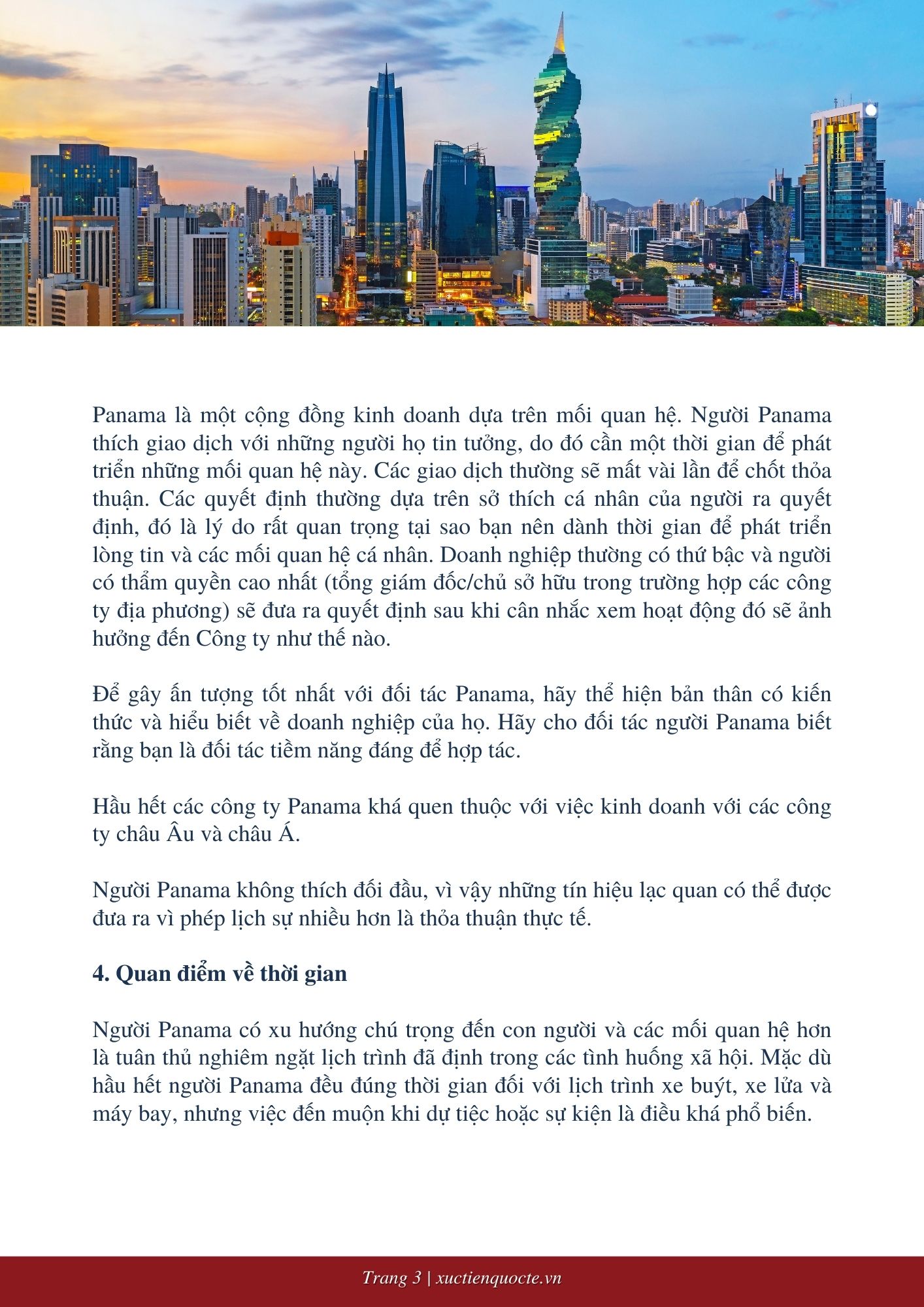 Panama là một cộng đồng kinh doanh dựa trên mối quan hệ. Người Panama thích giao dịch với những người họ tin tưởng, do đó cần một thời gian để phát triển những mối quan hệ này. Các giao dịch thường sẽ mất vài lần để chốt thỏa thuận. Các quyết định thường dựa trên sở thích cá nhân của người ra quyết định, đó là lý do rất quan trọng tại sao bạn nên dành thời gian để phát triển lòng tin và các mối quan hệ cá nhân. Doanh nghiệp thường có thứ bậc và người có thẩm quyền cao nhất (tổng giám đốc/chủ sở hữu trong trường hợp các công ty địa phương) sẽ đưa ra quyết định sau khi cân nhắc xem hoạt động đó sẽ ảnh hưởng đến Công ty như thế nào.