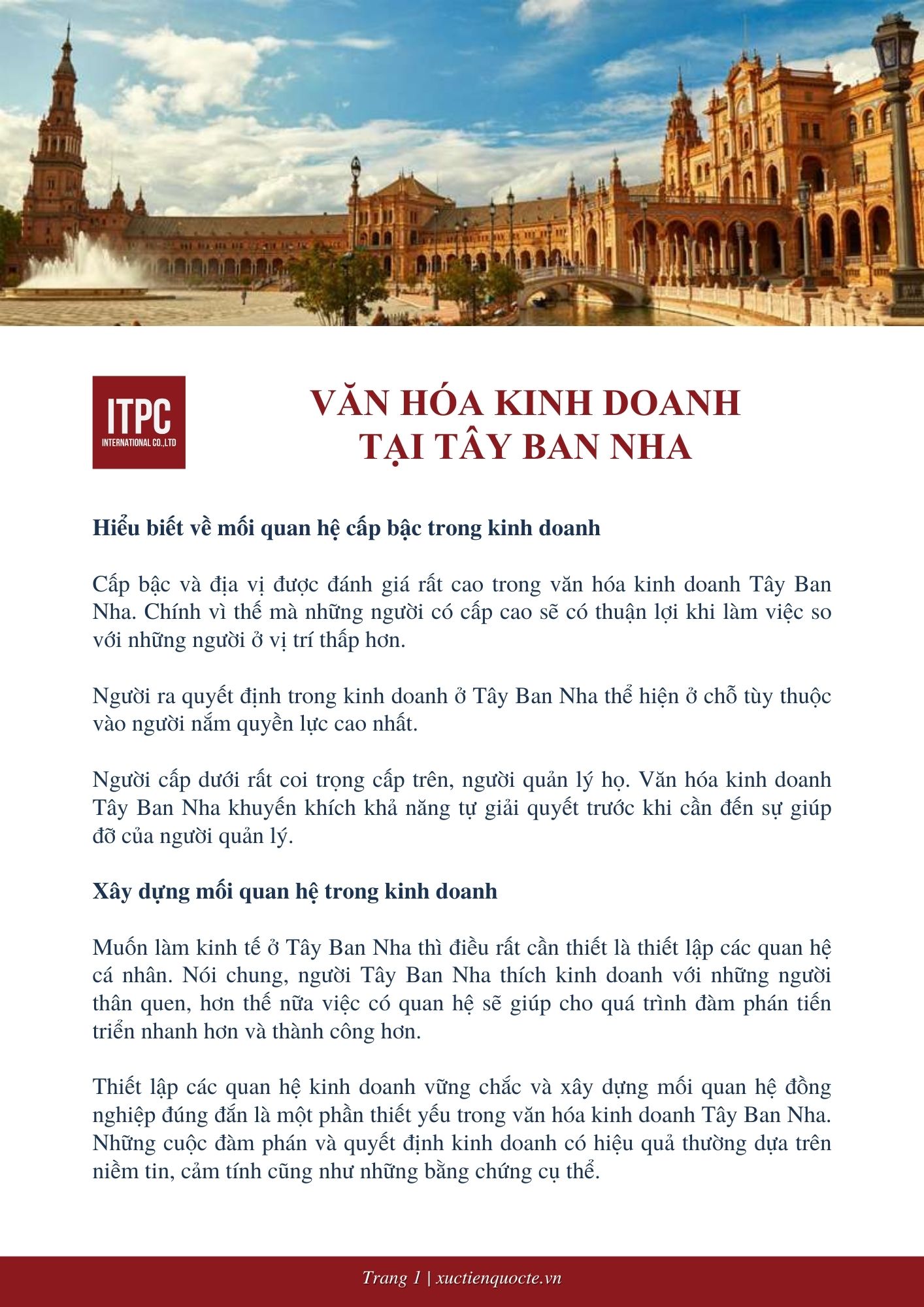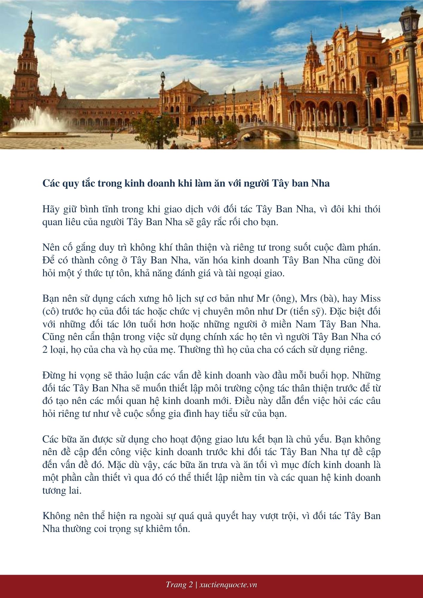 Muốn làm kinh tế ở Tây Ban Nha thì điều rất cần thiết là thiết lập các quan hệ cá nhân. Nói chung, người Tây Ban Nha thích kinh doanh với những người thân quen, hơn thế nữa việc có quan hệ sẽ giúp cho quá trình đàm phán tiến triển nhanh hơn và thành công hơn.
